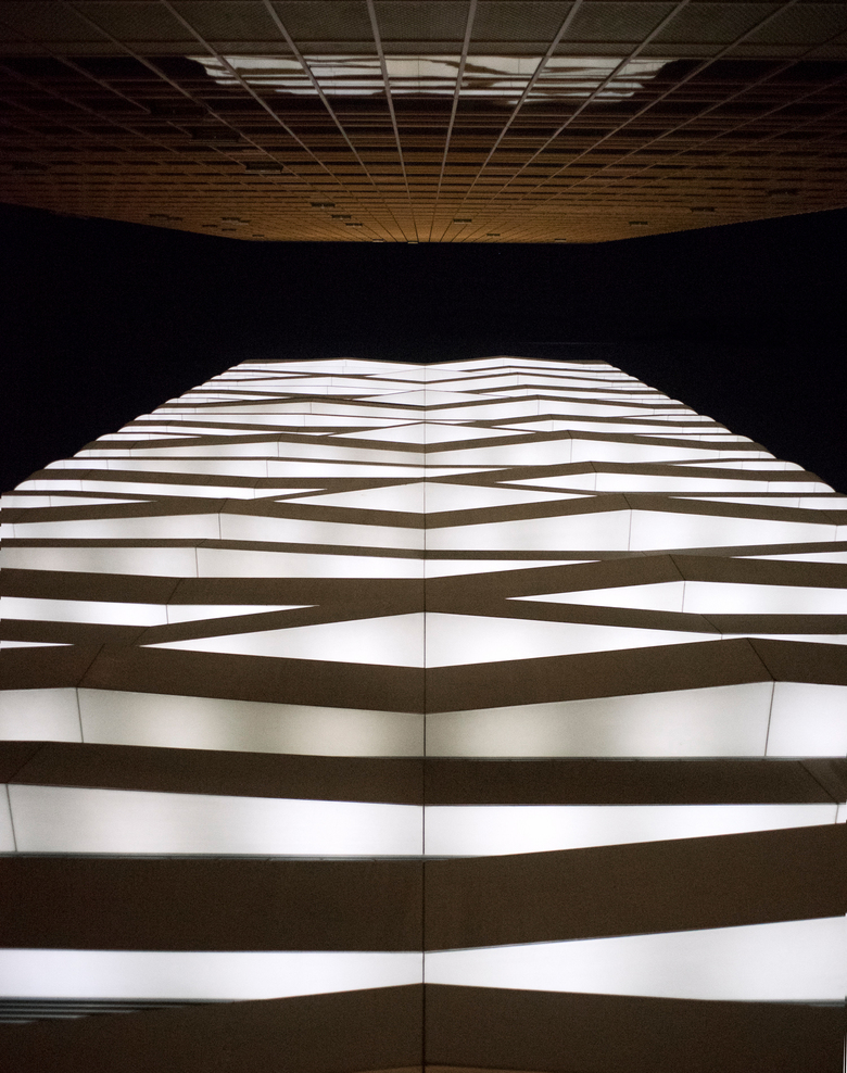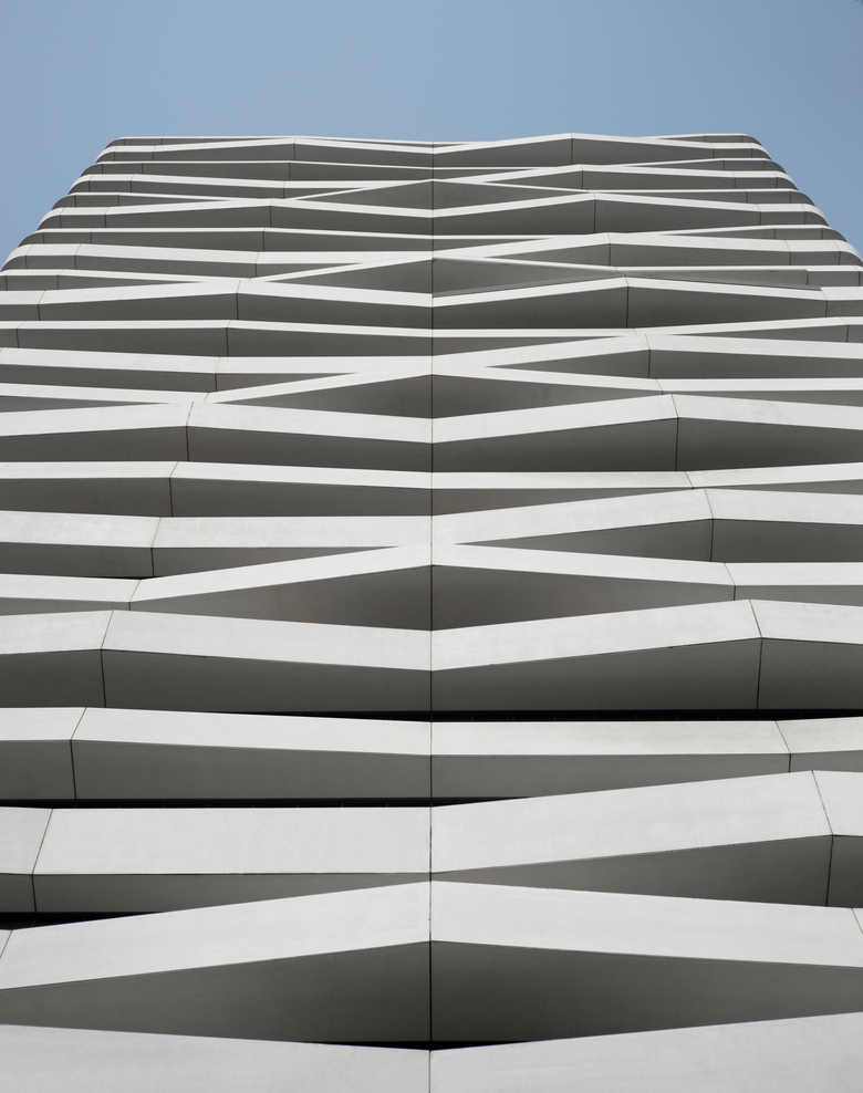 The ground level, with its glass-walled geometry, contrasts with the dynamic undulating design of the upper floors. It houses a branch office of the bank, an auditorium, an art gallery and a café. Below ground there are five levels reserved for parking and technical areas.