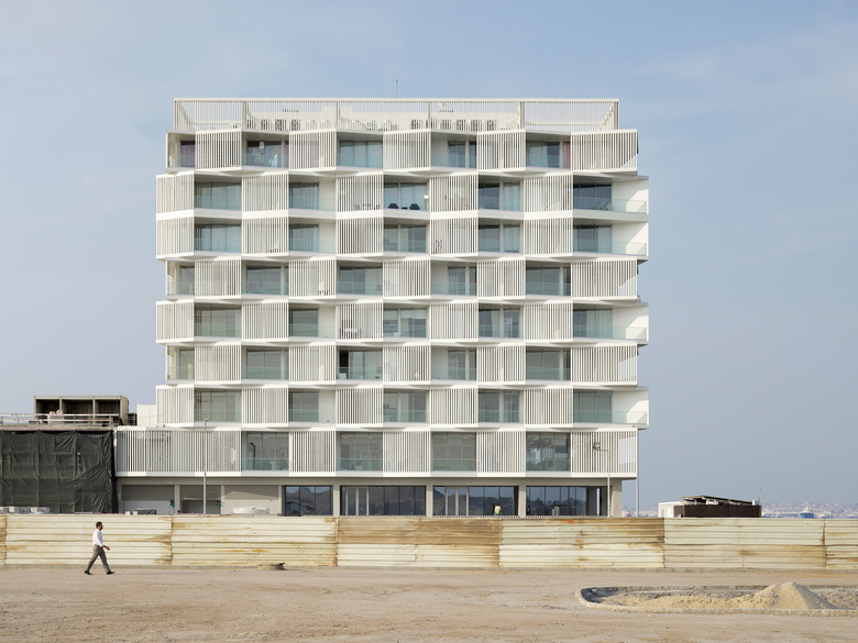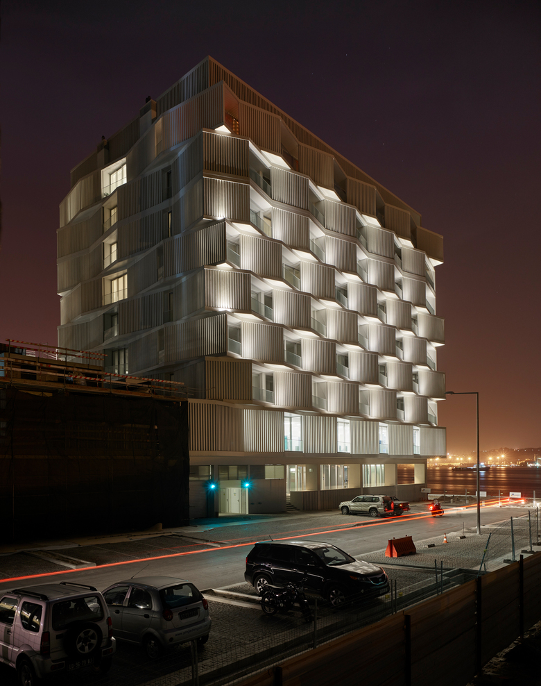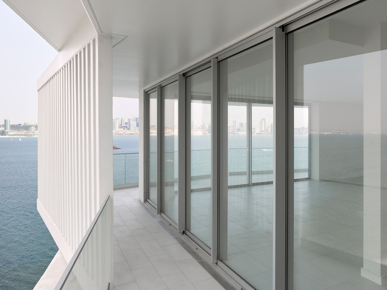 In the interior (which provides space for 28 apartments, each with either 2 or 3 aspects) one finds a refined narrative in the form of ample multiplication of visual perspectives over the horseshoe of the bay coastline and the city skyline.