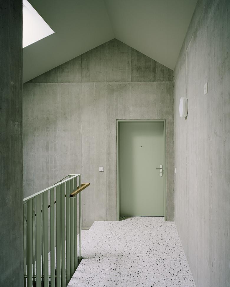 Die ehrliche Konstruktionsweise widerspiegelt sich im Innern, indem die Materialien wo möglich roh belassen sind. Sorgfältige Detaillierungen zum Beispiel in Form von Fensterfuttern, welche sowohl Gestaltungselement als auch eine bauphysikalische Verbesserung sind, zeichnen die Wohnungen aus.