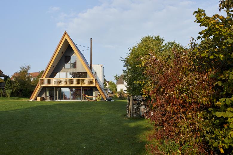 Der Ersatzneubau eines Gesellschaftshauses greift die Form des Vorgängerbaus auf, übersetzt den in den 1970ern populären A-Frame-Bautypus jedoch in die Neuzeit. Das neue Gesellschaftshaus liegt idyllisch an der Eschenzer Bucht am Bodensee, umgeben von einem grossen Garten mit Bootssteg. Der Neubau am Untersee ersetzt ein sanierungsbedürftiges Sommerhaus einer Familie. Wie dieses sollte auch der Ersatzneubau ein Ort der Begegnung, aber auch ein Ort des Rückzugs, der Stille und Abgeschiedenheit sein. Doch künftig öffnet sich