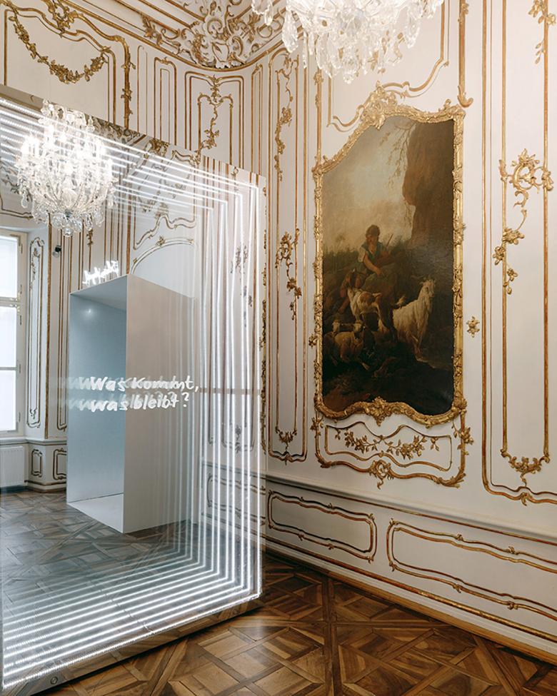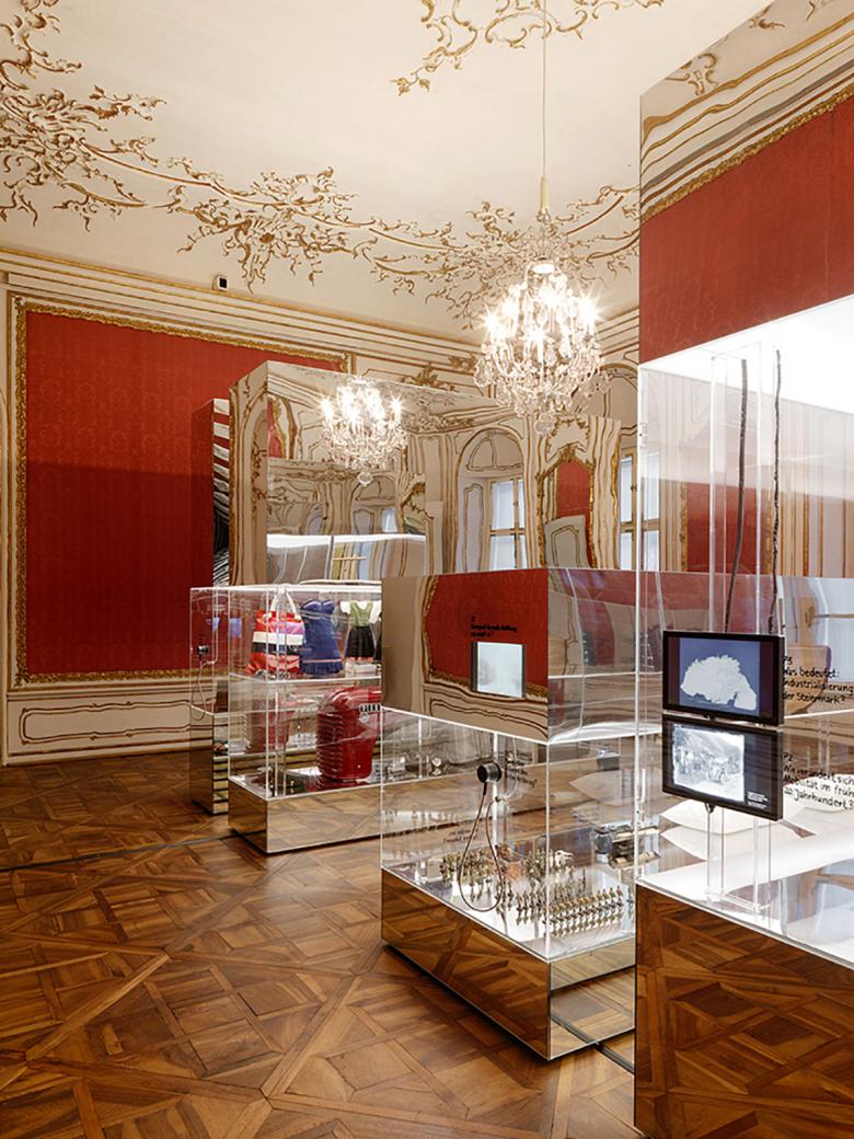 „100 x Styria“ zeigt das österreichische Kulturerbe im Historischen Museum Graz, untergebracht in einem Palais aus dem 18. Jahrhundert. Die skulpturale Spiegel-Glas-Licht-Installation und Ausstellung der Ausstellung im barocken Spiegelsaal ist von der historischen Nutzung der Kammer inspiriert, um ein mehrdimensionales Erlebnis zu schaffen. Die kulturellen Artefakte werden zu einer Leinwand der Zukunft und stellen einen Meilenstein in der Transformation dieses Museums dar: Besucher können den historischen Inhalt und Raum aus einer unerwarteten und unprätentiösen Perspektive erkunden.