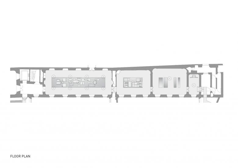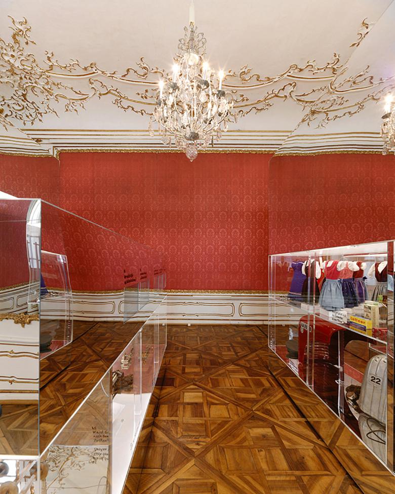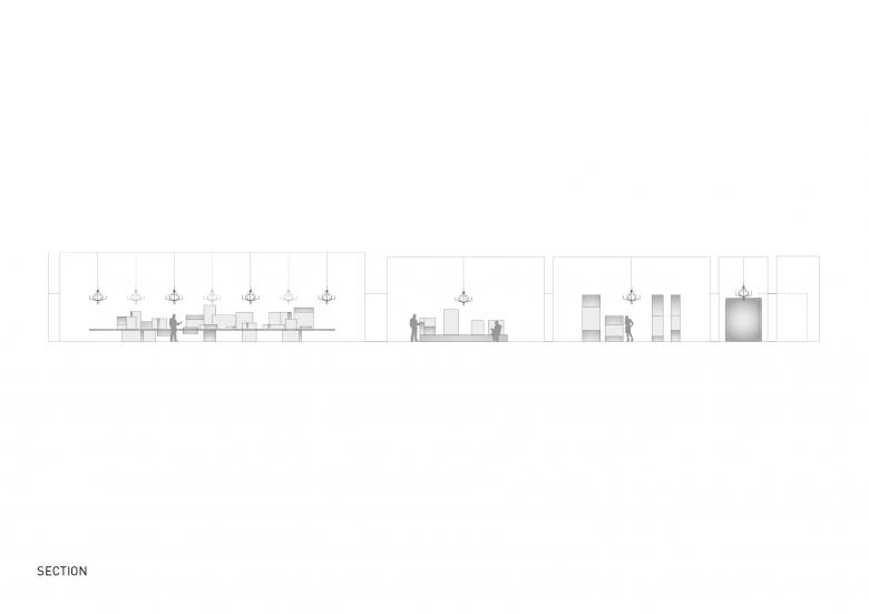 Präzise optimierte Möbelblöcke mit darunter integrierter Beleuchtung schufen eine schwebende Bühne für vielfältige Inhalte. Die verspiegelte Displaykomposition ermöglicht vielfältige Betrachtungsperspektiven der Objekte, enthält alle technischen Voraussetzungen und fungiert selbst als Kunstwerk, eine metaphorische und formale Reflexion von Raum, Zeit und Existenz.