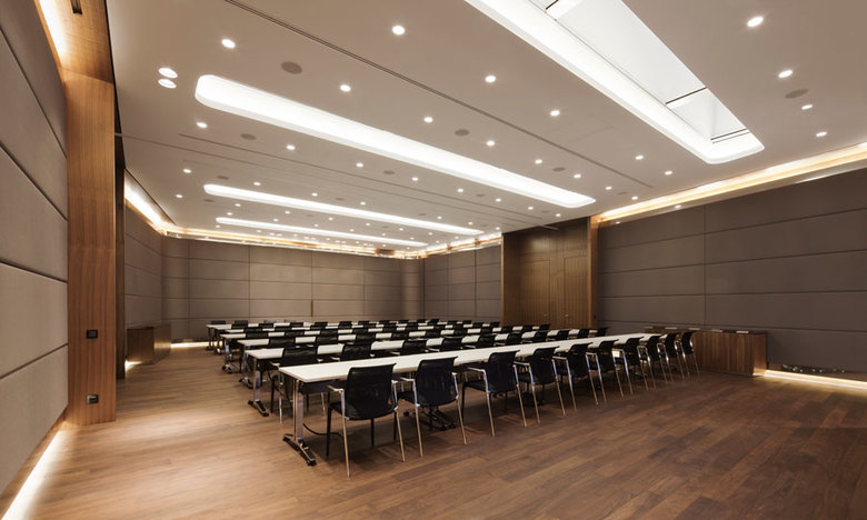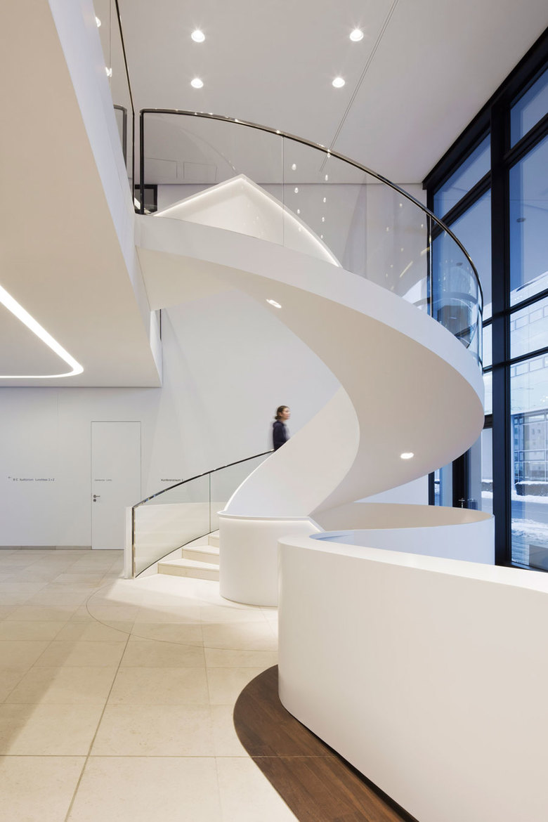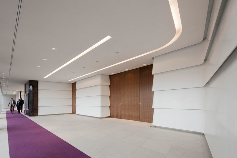 Die Umsetzung der Unternehmensphilosophie in „gebaute“ Corporate Identity umfasst neben der Eingangslobby, Cafeteria, Konferenzbereiche, Auditorium und Vorstandsbereiche auch die Arbeitsplatzgestaltung. Der neue Stil unterstreicht den firmeneigenen Slogan – Quality in everything we do – auf hervorragende Weise. Der offene Gebäudecharakter wird durch helle und elegante Farben in der Eingangshalle gesteigert. Verwendung von Holz, Naturstein und Corian als immer wiederkehrendes Designelement erzeugen eine natürliche und warme Atmosphäre. Das Designkonzept zieht sich durch das gesamte Objekt, selbst die Fahrstühle sind in Naturstein verkleidet, auch die Fassaden der Eingangshalle werden dadurch geziert. Als Farbpendant wurde ein kräftiges Bordeaux gewählt, das als Gegenspieler in Form von Teppichen oder Lederbezügen das zum Teil illuminierte Weiß und das warme Holz zum Leuchten bringt. Das Auditorium als eines der Schmuckstücke dieses Objekts geht eine gelungene Symbiose zwischen dem Material Corian als umschließende Hülle im Innen- und Außenraum und der Verwendung von warmem Holz und technisch anmutender Stoffwandverkleidung im Inneren ein. Ein weiteres Augenmerk gilt der Bibliothek, die sich in Empfangs-, Lese- und Ausleihbereiche gliedert. Die Cafeteria versprüht einen freundlichen und offenen Charakter, da sowohl das Farbkonzept, als auch das Mobiliar zum Verweilen einladen.
