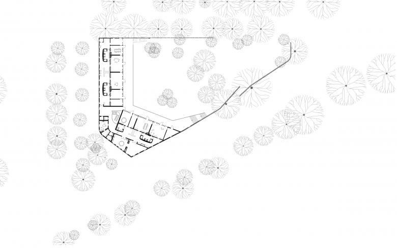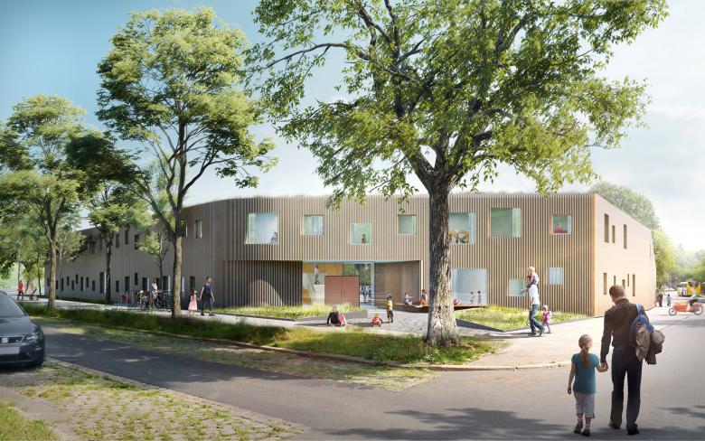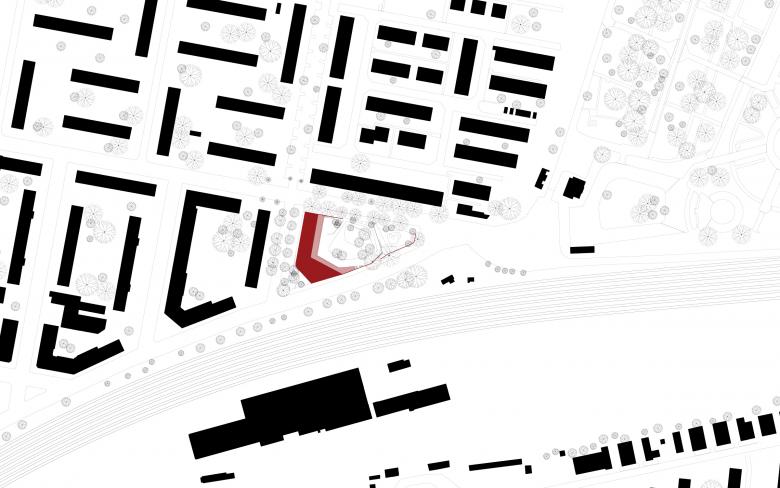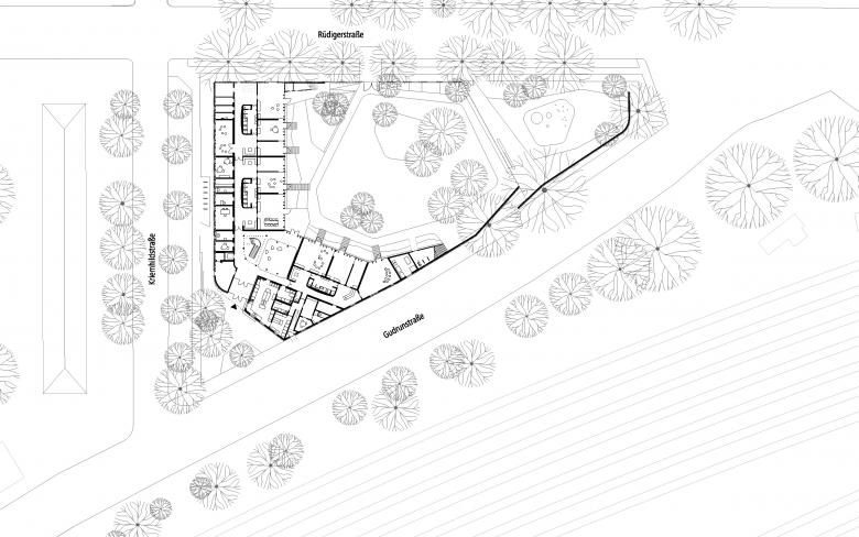 Die Lage und Ausformung des Baukörpers optimiert die Nutzung der Vormittagssonne und schliesst gleichzeitig Schallemmissionen aus dem Hofbereich aus. Die Teilung in den Hofbereich des Kindergartens und die öffentliche Spielfläche des Spielplatzes wird durch die räumliche Integration der Bestandsbäume zur selbstverständlichen Folge bereits bestehender Wegebeziehungen.