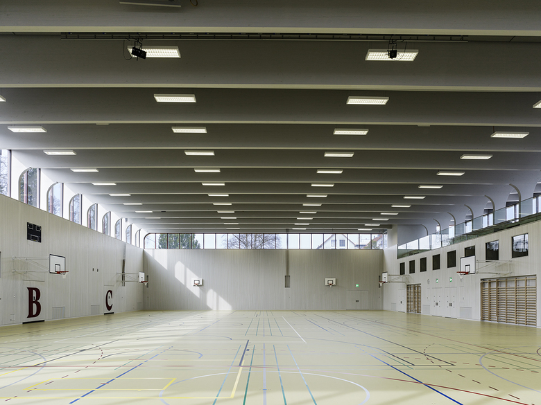 Dank der statischen Möglichkeiten von Brettschichtholz-Trägern konnte die Weite der Halle von 31 Metern überspannt werden. Im grossen Foyer des oberen Geschosses mit den angrenzenden Zuschauertribünen wird die Eleganz der filigranen Holzkonstruktion sicht- und unmittelbar spürbar. Die Rundungen der Träger und die Verglasung zum neuen Pausenplatz erinnern an eine Veranda und gewähren Aussicht auf das gesamte Schulareal.