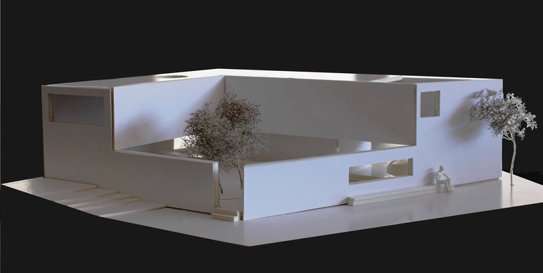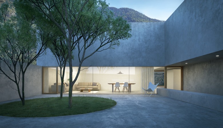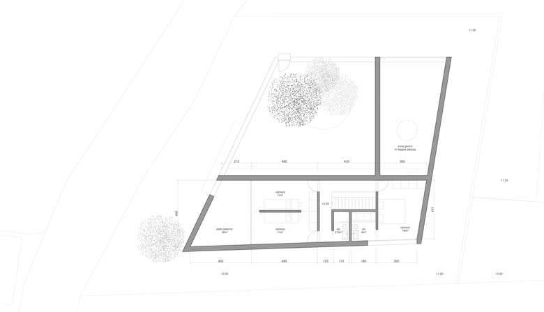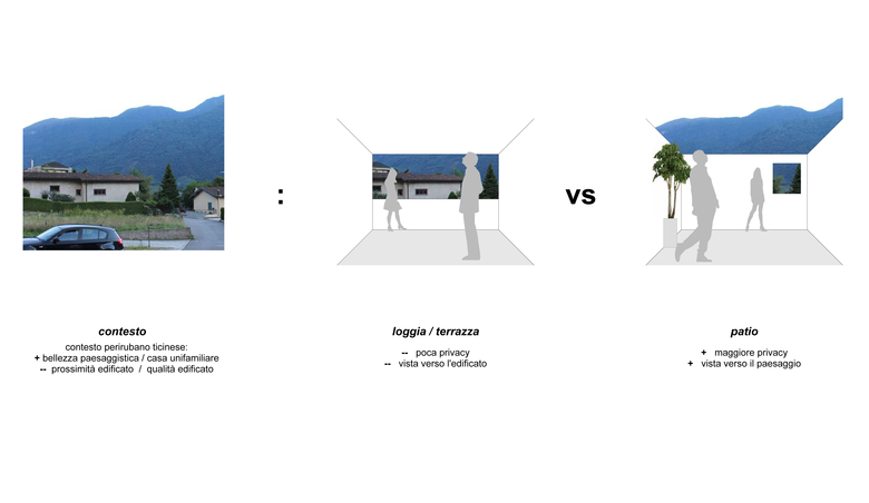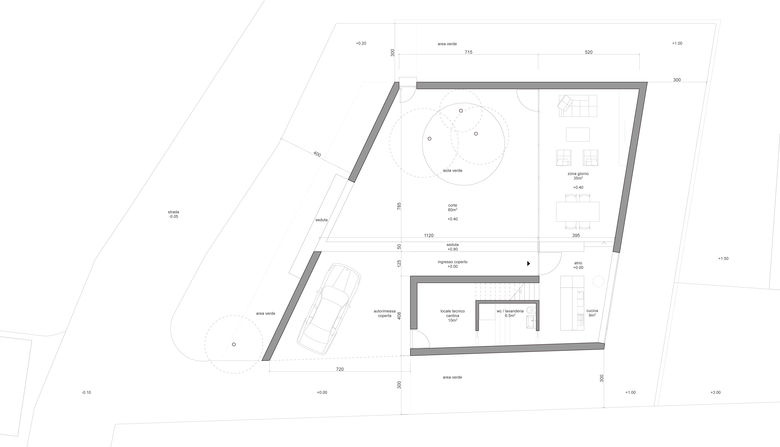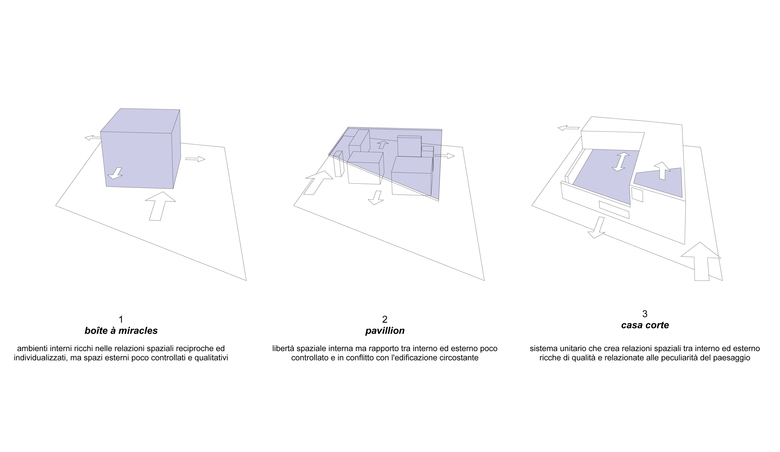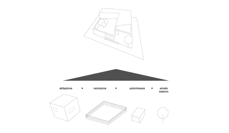 La nuova costruzione si integra volumetricamente con gli edifici esistenti nel contesto. Al contempo, assume un carattere tipologico che permette di soddisfare le esigenze di privacy al quale aspira la committenza e parimenti qualificare lo spazio pubblico della strada verso il quale si rivolge: un muro di cinta perimetrale definisce sia il limite del costruito sia uno spazio esterno protetto e privato (corte interna), permette dei punti di vista precisi dall’interno della casa verso il contesto paesaggistico di pregio circostante, e pone le basi per un arredo urbano puntuale che decora lo spazio stradale.