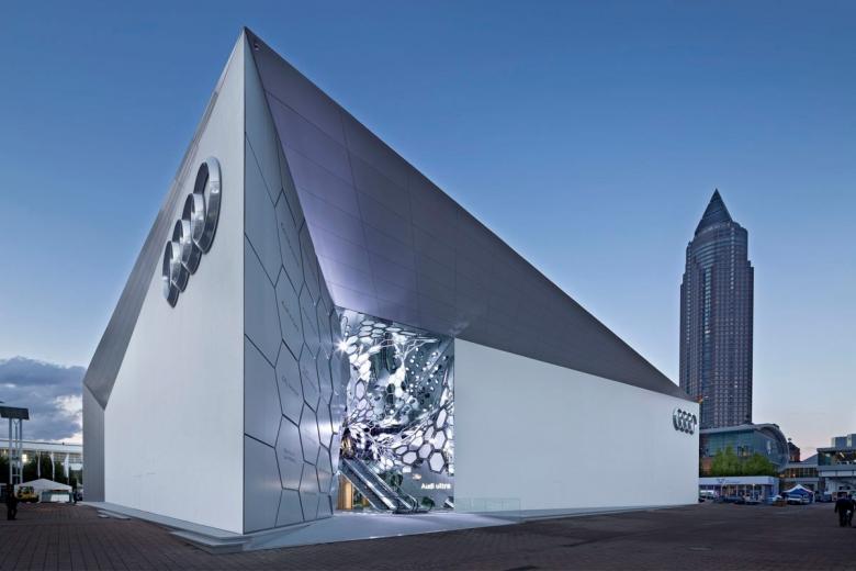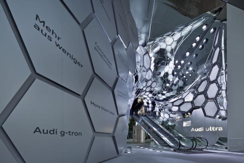 Auftakt des „Experience Walk“ ist die Fahrt mit einer Rolltreppe durch eine organisch vernetzte Leichtbauskulptur, die sich aus der Fassade des freistehenden Gebäudekubus entwickelt. Die Entdeckungsreise startet mit der dreidimensional gestalteten ultra-Struktur als spektakuläre Eingangsgeste. Der Besucher erlebt Leichtbau, effiziente Motoren und alternative Kraftstoffe. Der sich anschließende Ausstellungsbereich Audi Technologies gibt über ein virtuelles Fenster einen spannenden Blick auf die Hauptprotagonisten der Messe frei. Mittels Augmented Reality sind die Technologie-Innovationen den ausgestellten Automobilen zugeordnet und geben einen ersten Eindruck von der Innovationsfülle der Audi Ausstellung. Ein Spiel mit Dimension und Perspektive erwartet den Besucher im Bereich Audi quattro. Temperaturen von -21° schaffen eine Welt aus Eis, in der Branding und Kunstwerk den quattro-Lifestyle illustrieren. Dazu kontrastiert der Weg durch das Thema Audi Sport: intensive Rennsportakustik und dynamische LED-Installationen an Wänden und Decke lenken den Blick auf die Rennsport-Ikone Audi R18 in einer Steilkurve, die den nahtlosen Übergang in die Fahrzeugausstellung bildet.