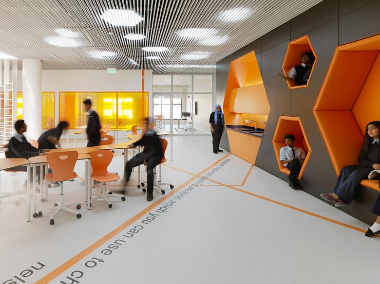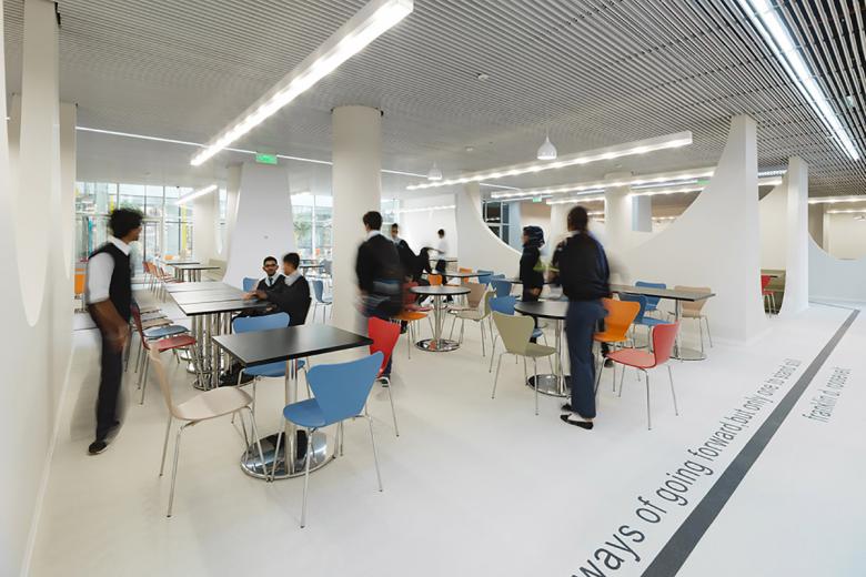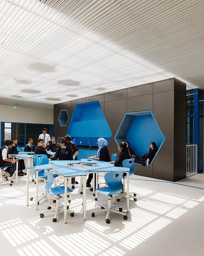 Die „Life Skills & Entrepreneurship Center“ ist ein Mehrzweckbereich für Gruppenunterricht, Vorlesungen und individuelles Lernen. Jedes Cluster hat in seinem Inneren einen bestimmten Farbcode, der die Zugehörigkeit symbolisiert und die Vielfalt der Studenten widerspiegelt.