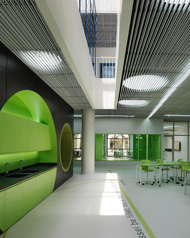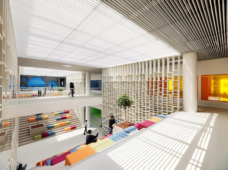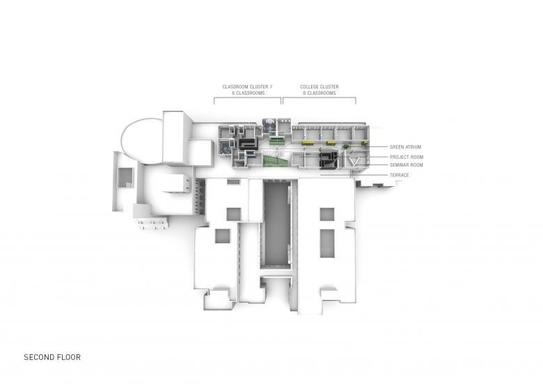 Der Marktplatz ermöglicht einen interaktiven Gemeinschaftsbereich und umfasst einen offenen Lernbereich mit einem geschlossenen Raum für konzentrierte Teamarbeit. Der Versammlungsraum ist eine offene Bibliothek und ein grünes Atrium, in dem sich die Studenten in ihrer Freizeit treffen. Darüber hinaus ist das Forum ein Auditorium und fungiert als vertikale Verbindung zwischen den Stockwerken.