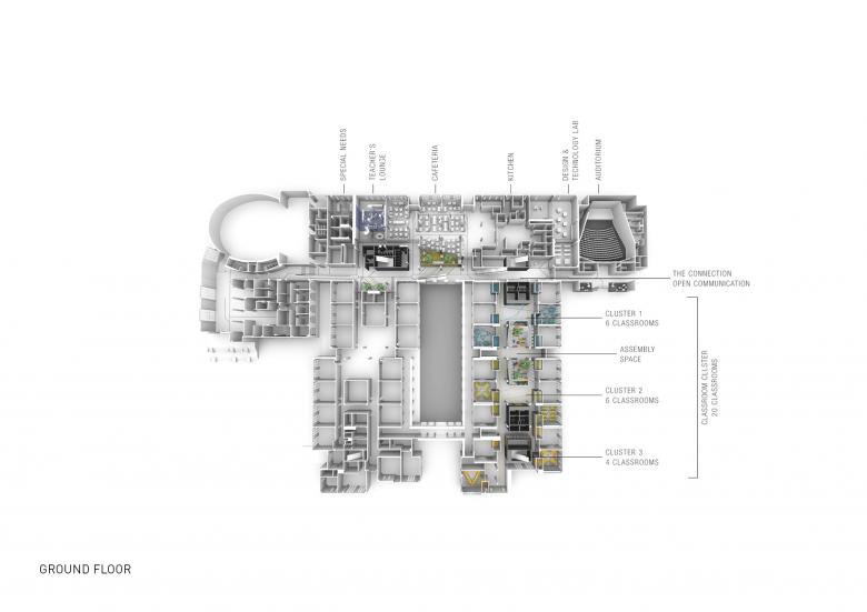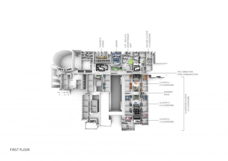 Der Hauptflur „the connection“ bietet offene Kommunikation mit unterschiedlichen Grundrissen. Entlang des Flurs befinden sich häufig genutzte „Wir-Plätze“, Bereiche für Sonderpädagogik, darunter ein Design- und Techniklabor mit Arbeitsplätzen, ein Vorbereitungsraum und Robotik.
