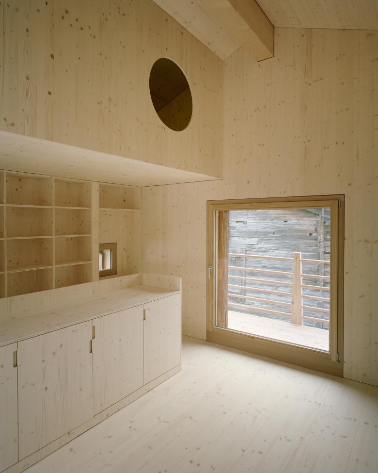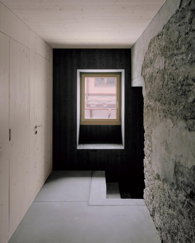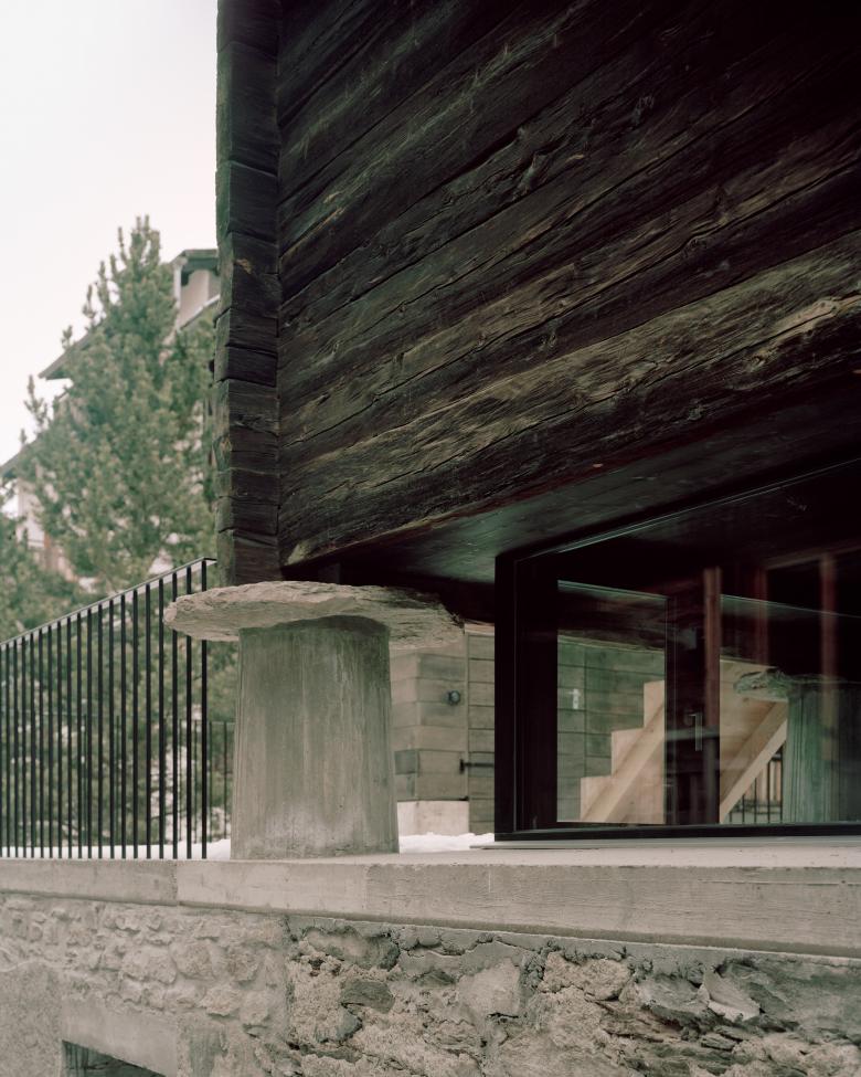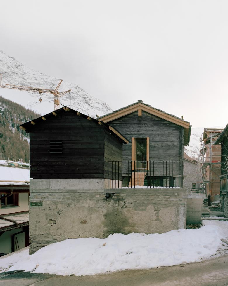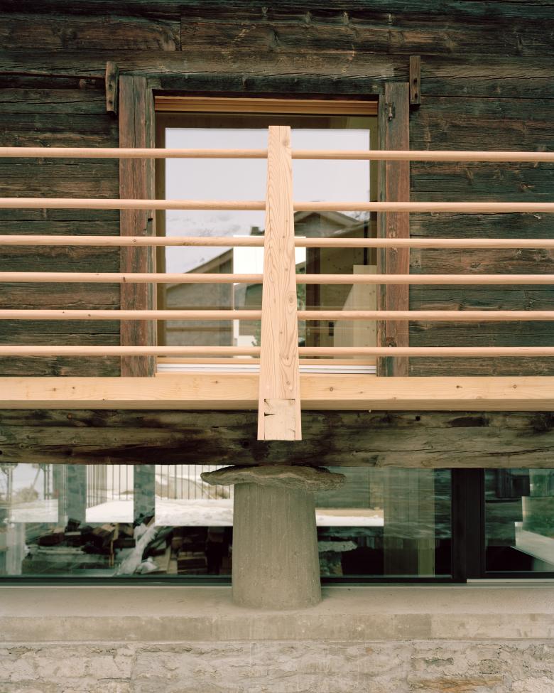 Mit dem Umbau des Stadels in ein Wohnhaus, konnte dessen Erhalt gesichert werden. Dabei wurde der Stadel unterfangen sowie der Zwischenraum hinter den Stützeln rundum verglast. Aus dem ursprünglich zweigeschossigen Bau wurde eine dreigeschossige Wohnnutzung. Das Zwischengeschoss wurde schwarz gefärbt, um weiterhin den schattigen und transparenten Charakter zu bewahren. In diesem Geschoss befindet sich die Küche mit Esstisch und der Ausblick schafft neue, unerwartete Sichtbezüge ins Dorf. Während der Sockelbau weiterhin eher mural wirkt und die Erschliessung, Nasszellen und Schlafzimmer beherbergt, wirkt der Wohnraum im Blockbau grosszügig und ist überhoch. Beim modernen Umbau haben wir Wert auf die traditionelle Strukturen der Stadelbauten gelegt und diese weiterinterpretiert. Von aussen wirken die Eingriffe sorgfälltig und unaufgeregt und der Stadel gliedert sich selbstverständlich in das Dorf ein.