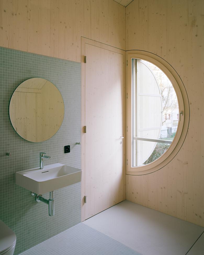 Ein feiner Holzfilter vor der Fassade, ein kleines Vordach und präzise gesetzte Öffnungen rhythmisieren das Volumen. Verspielte Details – etwa runde Fenster mit halbrunden Läden – verleihen dem Bau eine stille Eigenständigkeit, ohne sich vom Ensemble zu lösen. Der Neubau sucht keinen Kontrast, sondern einen sorgfältig komponierten Anschluss – architektonisch verankert im Ort.