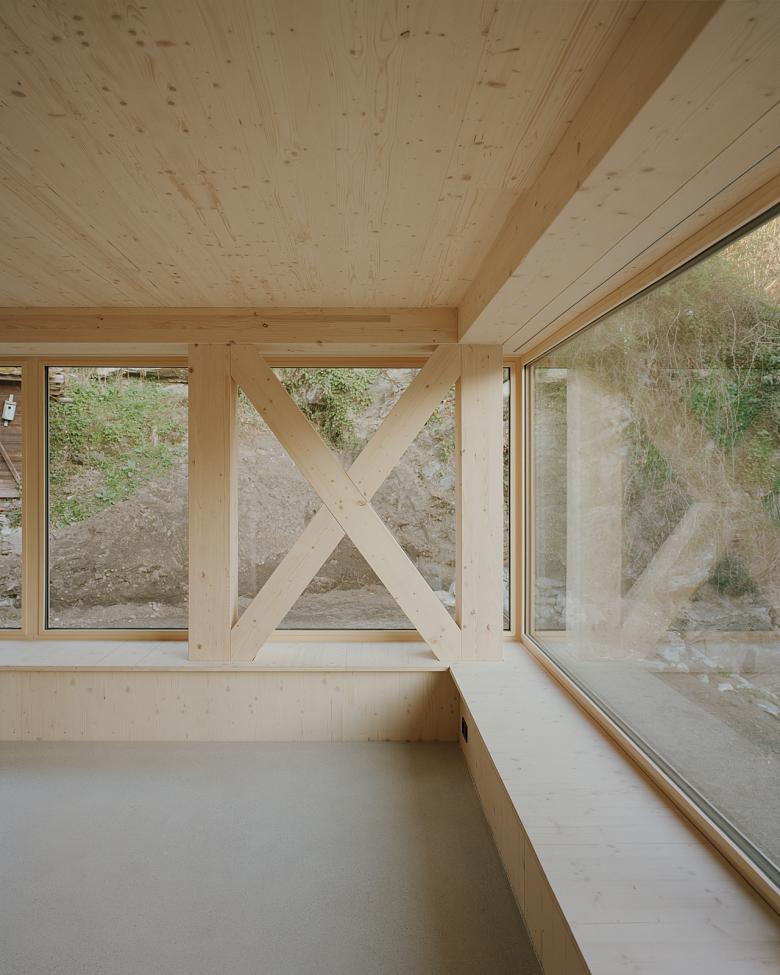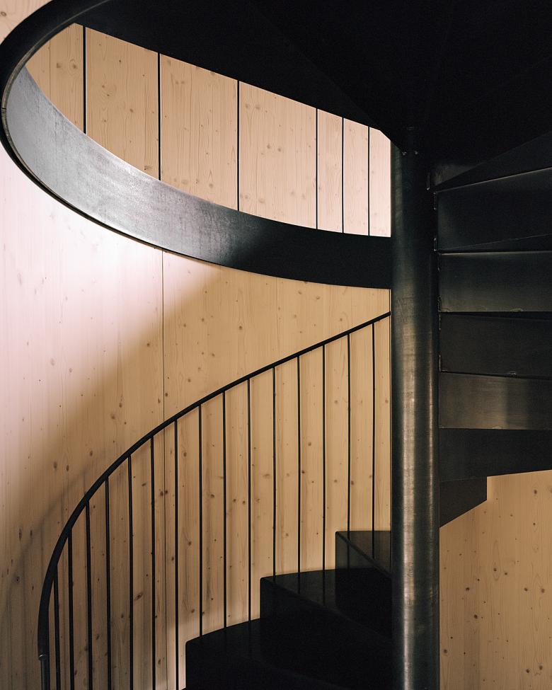 Im Innern gliedert sich das Obergeschoss durch eine gekreuzte Wand in vier gleichwertige Räume. Eine kompakte, gewendelte Treppe verbindet die Ebenen und setzt einen vertikalen Akzent. Der Baukörper in seiner Kompaktheit ist sowohl funktional als auch materialökonomisch effizient gehalten. Lokale Hölzer und auf das Notwendige reduzierte Geschossdecken tragen der Idee einer ressourcenschonenden Architektur Rechnung.