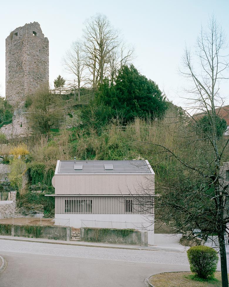 Am Fuss des Burghügels, im fein gekörnten Gefüge der Laufenburger Altstadt, fügt sich der Neubau als letzter Baustein zurückhaltend in die bestehende Häuserzeile ein. Seine Setzung und Orientierung reagiert auf die Topografie wie auf die Geschichte des Orts – einst Teil des Schlossgartens, heute Übergang zwischen historischer Altstadt und Neustadt. Der Bau antwortet mit einer eigenständigen Haltung, die zugleich introvertiert und offen ist.