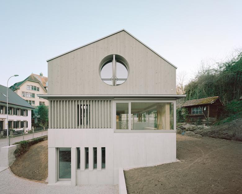 Ein steinerner Sockel, abgeleitet aus den Mauern der Umgebung, bildet das Fundament. Darauf ruht ein zweigeschossiger Holzbau. Die Organisation des Hauses folgt einer klaren Typologie: Strassenseitig zeigt sich die Fassade zurückhaltend geschlossen – ein Filter mit dahinterliegenden Fenstern, zur Öffentlichkeit. Gartenseitig dagegen öffnet sich das Haus mit durchgehenden Öffnungen, die die Innenräume mit dem angrenzenden Grünraum verweben.