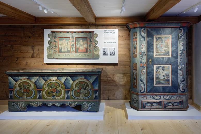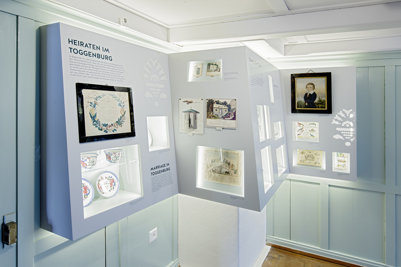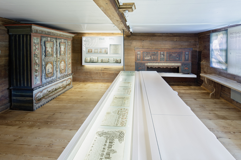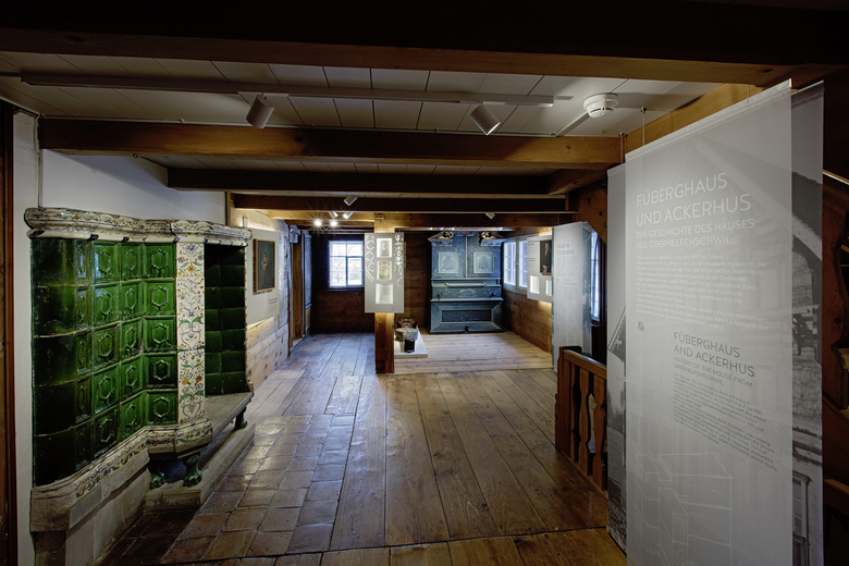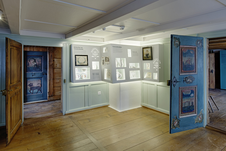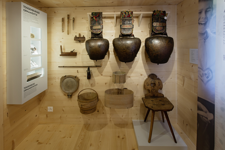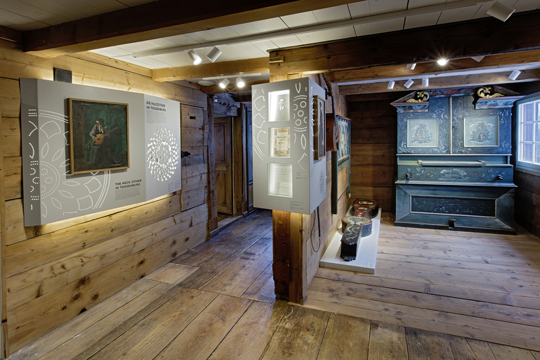 Für das historische Ackerhus von 1752 hat raumprodukt eine erfrischend neue Dauerausstellung entwickelt. Die Ausstellung spiegelt die Sammlungsschwerpunkte des Museums wieder: Toggenburger Hausorgeln, Toggenburger Halszithern und farbig gefasste Möbel aus der Säntisregion. Auch das Toggenburger Haus an sich mit seinen aus der gesamten Ostschweiz zusammengetragenen und in das Haus integrierten Bauspolien ist Ausstellungsobjekt.