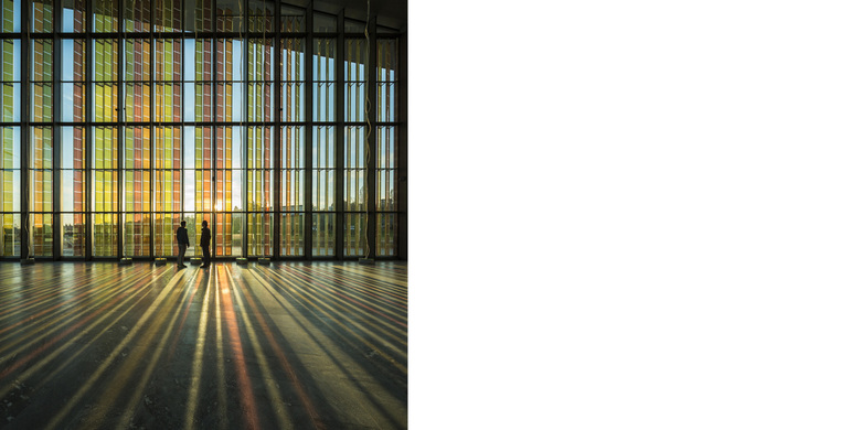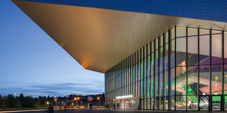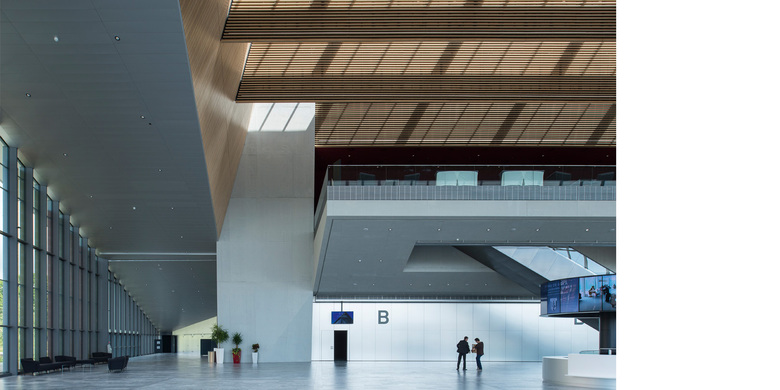A la porte d’entrée nord du campus, le Centre de Congrès, comme une pierre biseautée, constitue sans conteste un nouveau symbole et un point de repère dans le paysage. La “carapace” métallique du Centre de Congrès, générée par l’espace intérieur, se détache progressivement du sol libérant ainsi de grandes surfaces vitrées orientées au sud (côté foyer) et au nord laissant la lumière naturelle entrer dans la grande salle. Cette dernière peut être subdivisée selon différentes configurations - de plusieurs petites salles jusqu’à une seule grande salle plane pour les banquets ou d’autres types de manifestations. Ces partitions sont possibles grâce à un système de parois mobiles ainsi qu’à un système de sièges escamotables. Le Centre de Congrès abrite en outre un grand foyer utilisé également comme espace d’exposition et, au niveau inférieur, diverses salles de commissions distribuées autour d’un second foyer.