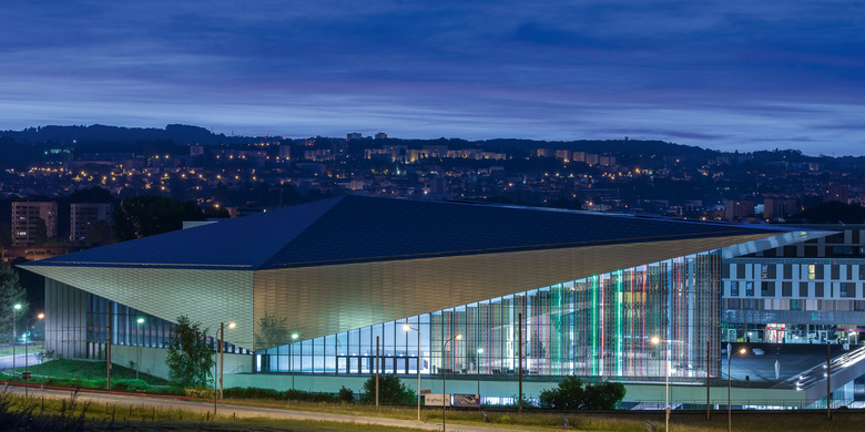 La structure porteuse du Centre de Congrès, en forme de catamaran, est composée de deux grandes poutres métalliques tridimensionnelles appuyées sur deux paires de noyaux de service en béton armé situés au centre et au nord du bâtiment. Au sud, ces poutres sont en porte-à-faux. Le revêtement de la couverture en aluminium anodisé naturel contraste avec le caractère plus intimiste et raffiné de tous les revêtements intérieurs en bois naturel. A son tour, la légèreté des revêtements des espaces intérieurs contraste avec la présence imposante des noyaux verticaux et des grands balcons de la salle et du foyer.