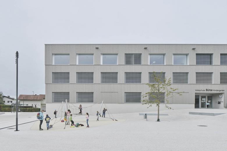 Die Marktgemeinde Wolfurt in Vorarlberg im Bezirk Bregenz wollte ihre Volksschule im Dorfteil Bütze erweitern und den benachbarten Kindergarten mit Krippe integrieren. Man entschied sich, den dreigeschossigen Bestand aus den sechziger Jahren vollständig zu sanieren und jenen aus den neunziger Jahren aus bauphysikalischen Gründen großteils abzutragen. Die Turnhalle im Untergeschoss wurde erhalten und mit zwei neuen Stockwerken überbaut. Der 60 Meter lange und 27 Meter tiefe Neubau aus einem Holztragwerk mit einer flächigen, holzverkleideten Fassade und verputzter Sockelzone, die auch für den Bestand übernommen wurde, ergänzt nun harmonisch die gesamte Schulanlage. Das neue Haus mit jeweils einer Pergola an den Enden fügt sich ruhig in die schöne Umgebung mit Wiesen und Bäumen und die dörflich geprägte Nachbarschaft.