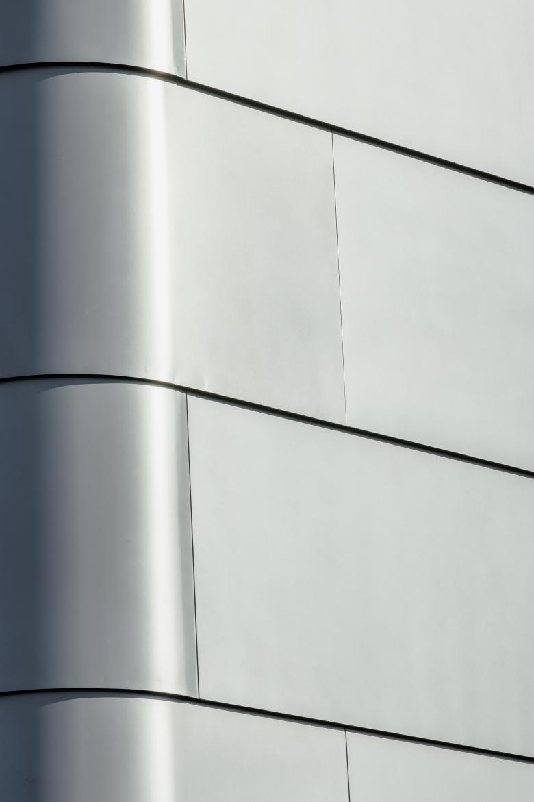 Die Bekleidung wurde als vorgehängte hinterlüftete Fassade ausgeführt. „Die Fassadenelemente weisen eine Stärke von 4 Millimetern auf mit rückseitiger Aufhängung und Aussteifung“, berichtet Jacques Otter. Die einzelnen Fassadenelemente bestehen aus pulverbeschichtetem Aluminium in der Farbe RAL 9007 Graualuminium. Insgesamt wurden 210 Fassadenelemente mit verschiedenen Abmessungen, die im Durchschnitt 2,44 Quadratmeter pro Tafel betrugen, befestigt. Bei einer abgewickelten Länge von 54 Metern über zwei abgerundete Ecken und einer Höhe von 9,5 Metern kam eine Fläche von 513 Quadratmetern zusammen.