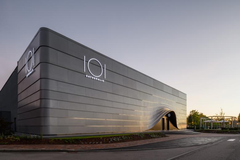 Für die neue Sensation legte der Bauherr hohe Maßstäbe an die Gestaltung. „Das futuristische Konzept haben wir in der Fassade übersetzt als das Bild eines Theatervorhangs, der sich über dem Eingang in einer doppelten Krümmung wie von unsichtbarer Hand öffnet. Der Besucher wird eingeladen, einen Blick in die kulinarische Zukunft zu werfen“, erklärt Moritz Josch, zuständig für Projektmanagement im atelier 522. „Über die Materialität der Fassadenelemente aus Aluminium und der geschuppten, hochwertigen Ausführung erreichen wir eine harmonische Ausführung wie aus einem Guss, zugleich aber auch eine cleane, uneindeutige und minimalistische Optik, die die menschliche Begrenzung symbolisiert.“