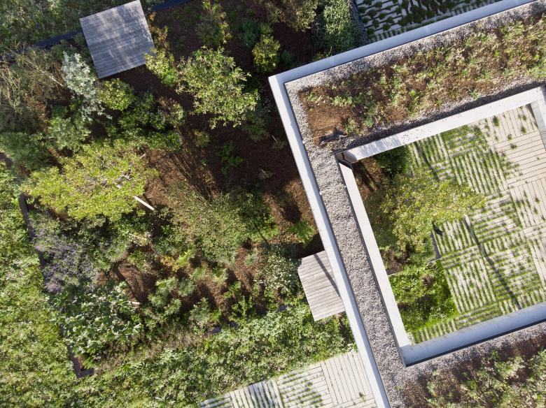 Das Dach ist ausserdem Teil des Wassermanagementsystems, da es stark bepflanzt ist und die gesamte Dachfläche und ihre Hochbeete als Wasserspeicher funktionieren. Dies ermöglicht eine die Wartung des Daches zu beschränken, da das meiste Wasser von Dach und Fassade für die Pflanzen verwendet wird.