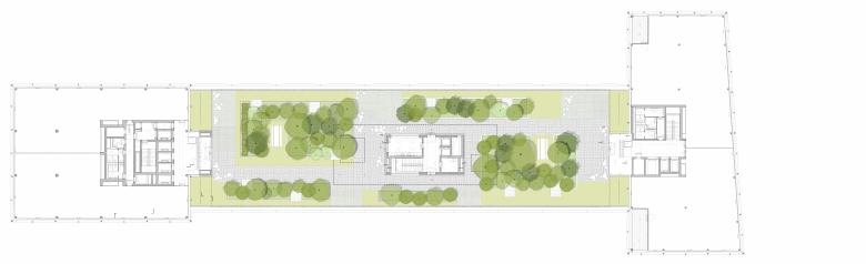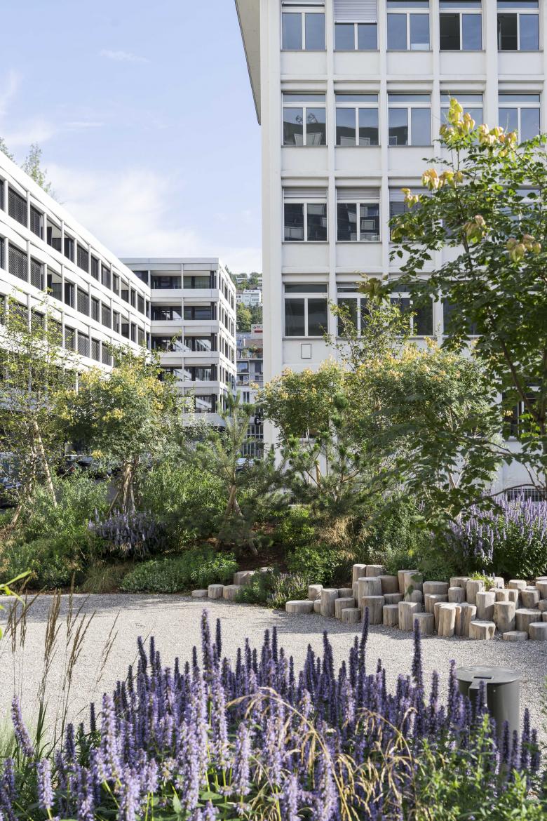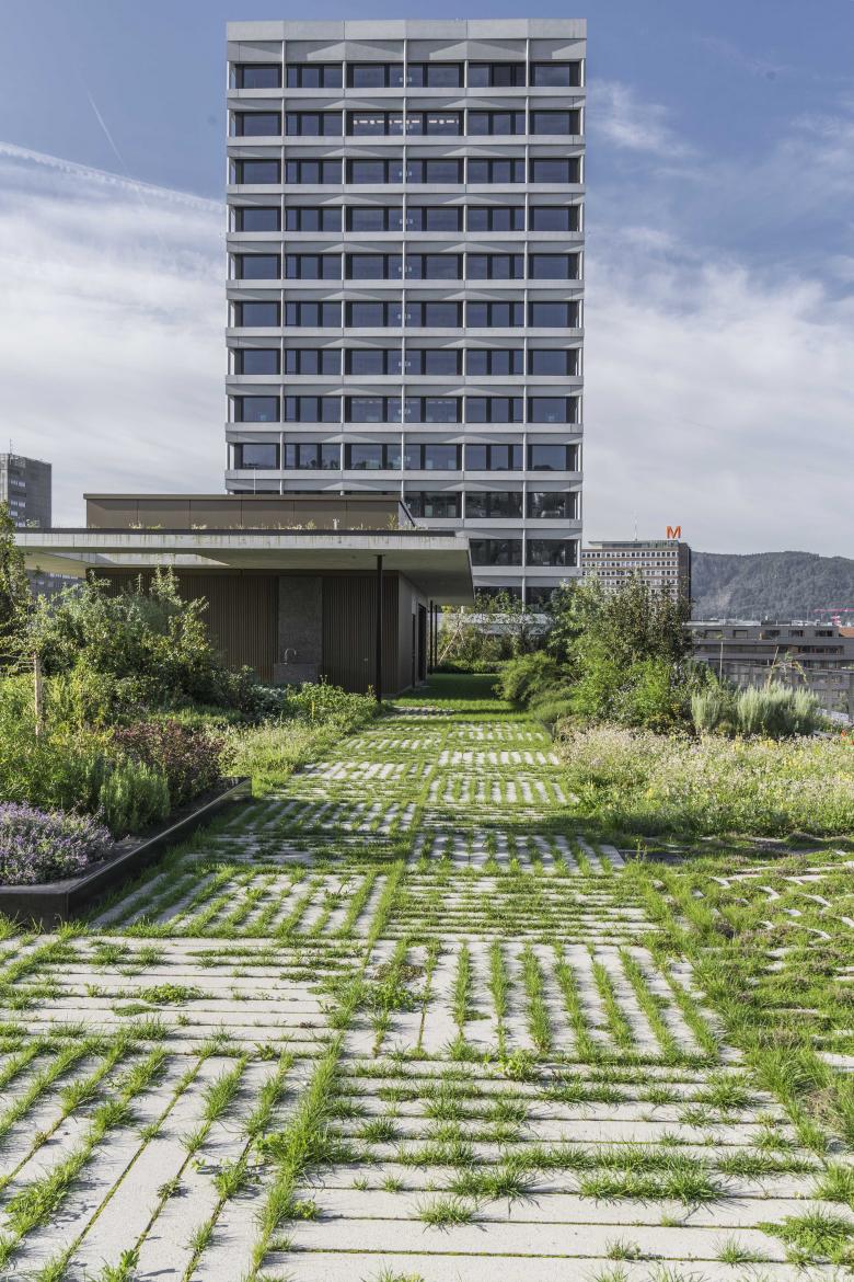 Der andere Teil des Areals ist der Dachgarten, der in Zürich West eine besondere Bedeutung hat. Er wird nicht nur als privater Garten des Hauses gelesen, sondern ist auch ein wichtiger Teil der Dachbegrünungslandschaft, die sich derzeit in Zürich West stark entwickelt. Die grossen Flächen im Erdgeschoss sind stark frequentiert und schwierig zu bepflanzen und zu entsiegeln. In diesem Sinne sind die Dächer oft die einzige Möglichkeit grössere, zusammenhängende Grünflächen ins Quartier zu bringen.