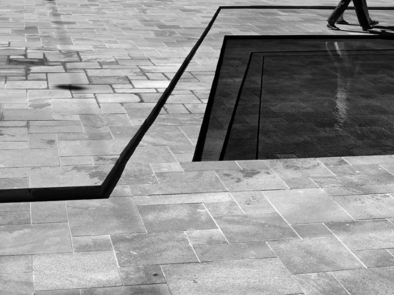 Über eine Schichtung von gesägten und gebrochenen Muschelkalk-Platten entsteht das Bild einer steinernen Wasser- Landschaft, deren Massstäblichkeit sich je nach Blickwinkel ändert. Von Innen schafft sie, gefasst durch die mächtigen Fassaden, eine begeh- und besitzbare, räumlich differenzierte Miniatur eines moosigen Fels-Reliefs. Demgegenüber entsteht im Aufblick das abstrakte Bild einer Schollen-Landschaft, deren Ausdruck sich permanent über die Lichtreflexionen wandelt.