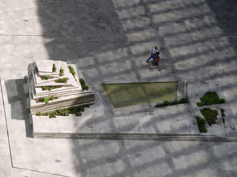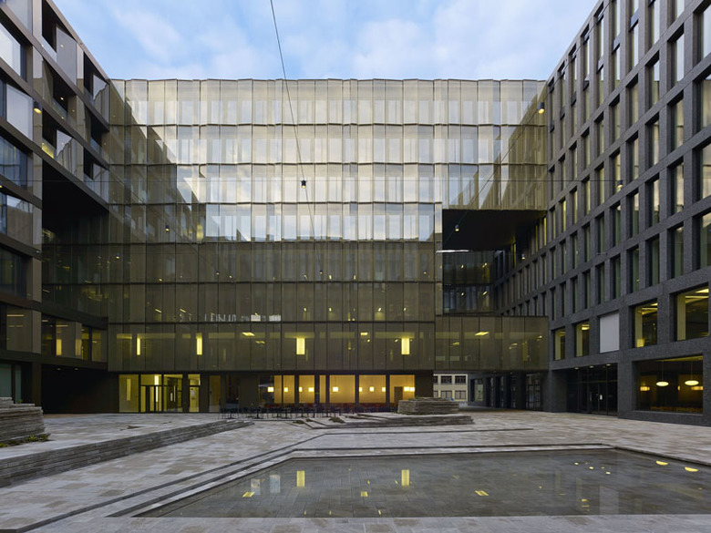 Der Kern des Hofes, ein fast sakraler Raum mit den kompakten Massen eines Raum-Würfels von ca. 30x30x30 Metern, wird geformt durch unterschiedliche Fassaden-Architekturen, die sich in ihrer Materialität und topographischen Gestaltung stark voneinander unterscheiden. Deren Oberflächen stehen im Wechselspiel zum hellen Muschelkalk-Boden mit dessen eingelassenen Wasserbecken. Der stetig wechselnde Lichteinfall bespielt diese Flächen mit unterschiedlichen Reflexionen und gibt dem Raum dadurch etwas Bühnenhaftes. Die Kompaktheit des Raumes und die spürbare Materialität der Oberflächen schaffen einen Raum von geradezu physischer Präsenz, der sich der Geschäftigkeit des Stadtquartiers entzieht. Er sucht die Differenz zur Umgebung und schafft etwas was es nicht gibt im öffentlichen Raum - der Hof schafft Ruhe.
