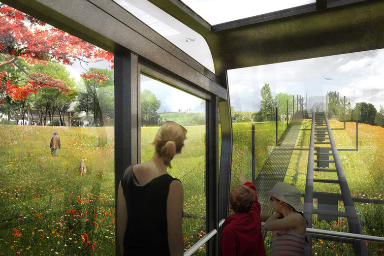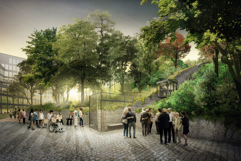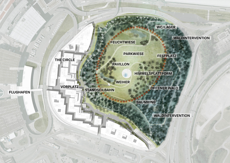 Das Entwurfskonzept bespielt die vier vertikalen Ebenen des Ortes: Himmel, Wald, Gletschermoräne und Topografie. Zwei Basisinterventionen bestimmen die subtile Umgestaltung des Parks. Waldlichtung: Ein Baumring umschliesst eine ovale Lichtung von 200 m Durchmesser. Berg und Plateau: Die Gletschermoräne ist eine abstrakte, topografische Landschaftsskulptur, die in der Himmelsplattform gipfelt, welche mit der Seilbahn vom Circle erreichbar ist. Der Park wird weiter inszeniert durch Elemente wie Waldloop, Skyloop, Waldpavillon, Skygazing Sessel und Wasserspiegel, welche den Hügel bespielen.