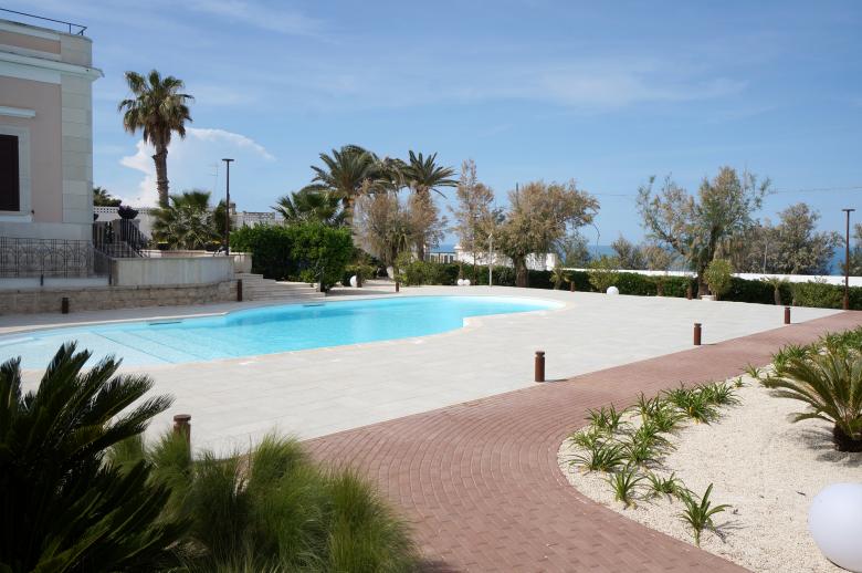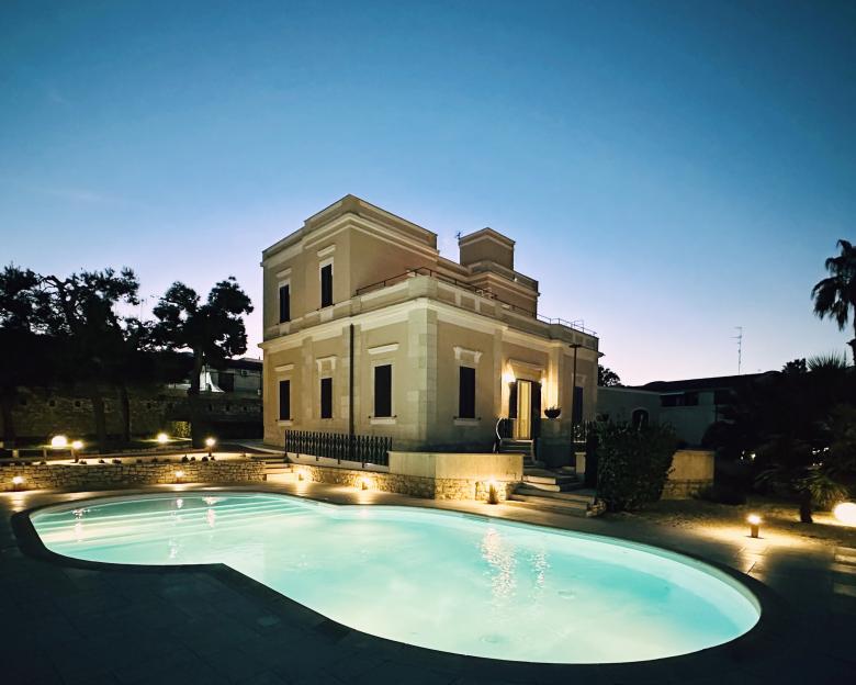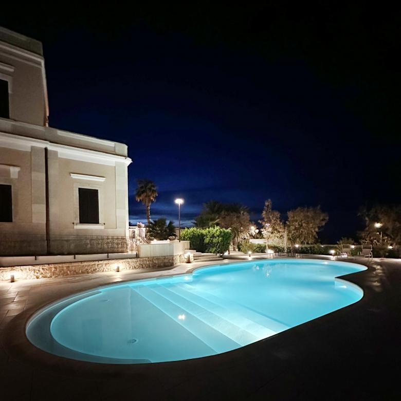 La piscina, mantenuta nella forma originale è stata completamente rinnovata inserendo una zona di acqua bassa per prendere il sole ed inserendo dei gradoni di ispirazione Art Decò. La visione notturna restituisce il progetto della luce che definisce i percorsi di accesso e del giardino e la zona della piscina, illumina la scala di accesso della villa e della sua facciata con corpi illuminanti dal disegno minimale.