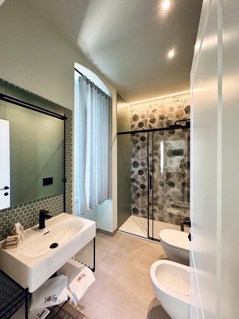 All’interno dei bagni, accanto al tono neutro del pavimento in pietra, emergono deglie elementi cromatici e decorativi: il nero opaco delle rubinetterie e dei profili metallici crea un contrappunto di segno grafico sui disegni floreali. Lo spirito Decò dell’epoca, seguendo una puntuale richiesta della committenza, è stato reinterpretato con l’introduzione di variegate grafiche floreali moderne.