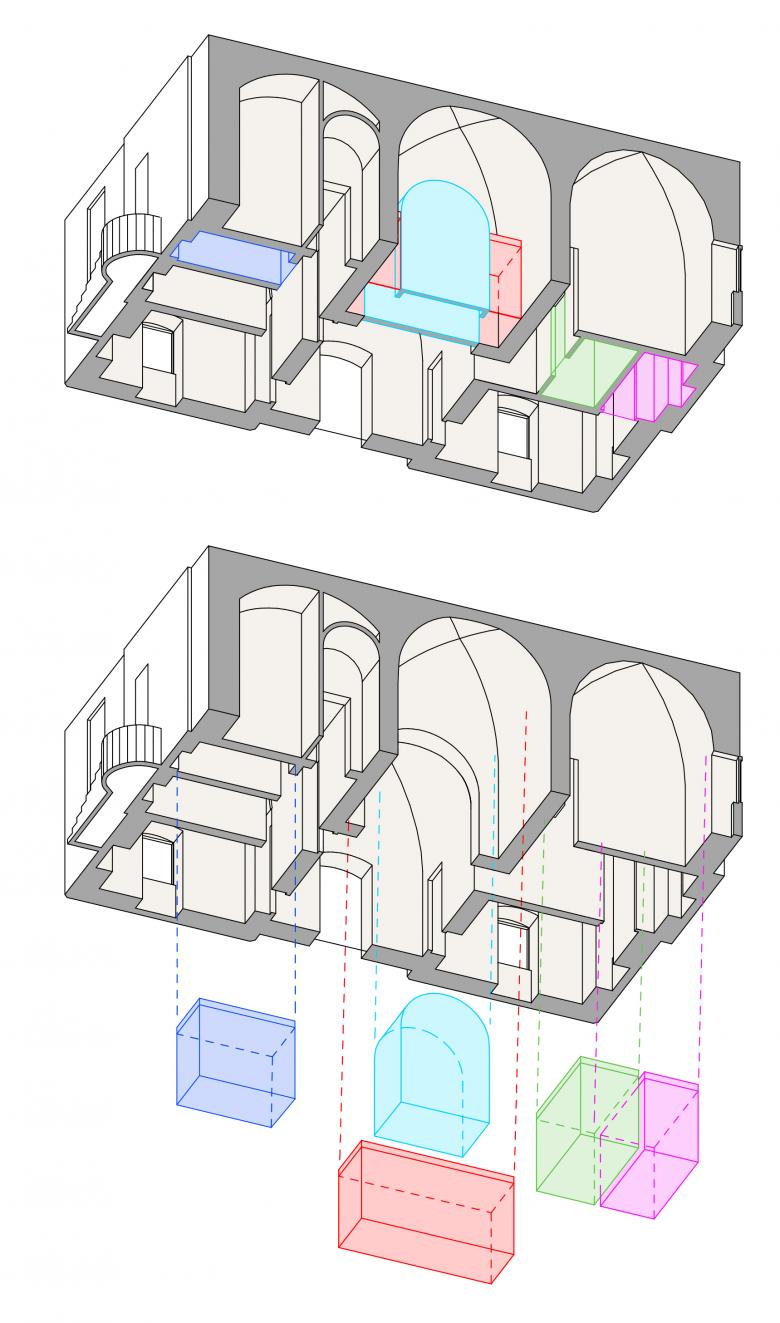 La struttura dell’architettura, i setti murari, le volte, le aperture, sono state mantenute e risanate attraverso la rimozione di tutte le finiture superficiali non originali che ne limitavano la traspirazione, che stavano causando il deterioramento delle strutture in tufo.
