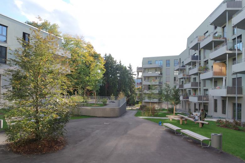 Die Bauvolumen in ihrer unterschiedlichen Geschossigkeiten sind der Hanglage entsprechend definiert, damit sich das Erdgeschoss treppenartig vom Niveau der Umgebung loslöst und spannende Vorbereiche entstehen. Der dadurch entstehende Sockelbereich schafft die gewünschte Privatheit der Wohnungen im Erdgeschoss. Das gewachsene Terrain bleibt im Hofbereich erhalten. Kleine Geländemauern schaffen Grün- und Aufenthaltsflächen, die als leicht aufstehende Geländescholle ausgebildet sind. Durch das Anheben der Grünflächen entstehen Aufenthaltsbereiche mit geringem Gefälle, die auch sehr selbstverständlich den geforderten exklusiven Nutzungen von Kindergarten und Kinderkrippe zugeteilt werden können. Nebst der repräsentativen Terrassenfläche beim Restaurant wird ein attraktiver Siedlungsplatz geschaffen, der in Kombination mit dem Gemeinschaftsraum seiner Funktion gerecht wird.