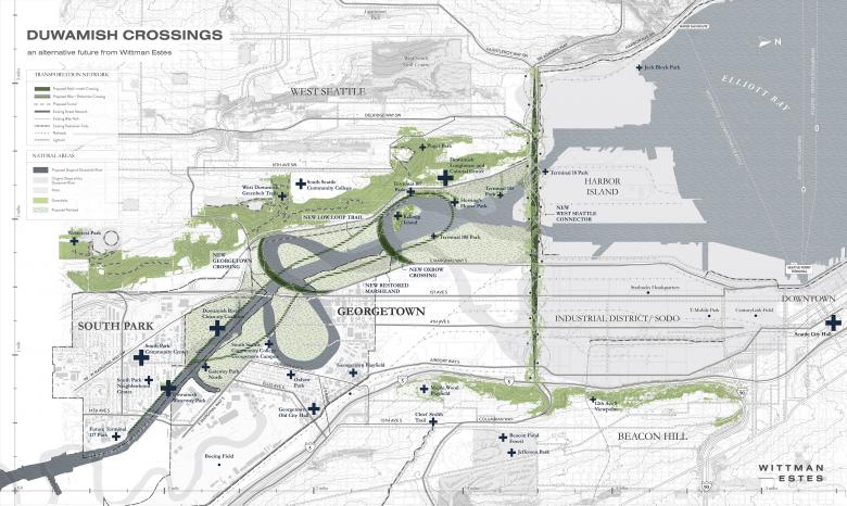 Duwamish Crossings is a plan to replace the bridge with a series of ecological connectors and bring back nature to and around the Duwamish River. The initiative is a platform to promote a network of crossing and network proposals, mapping, studies, and news for advocates for a better future for the Duwamish River.