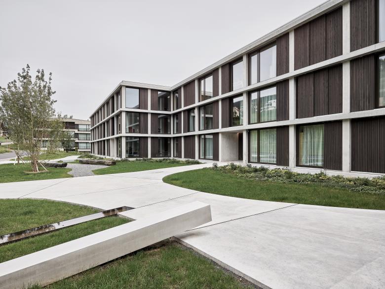 Der architektonische Ausdruck der Gebäude wird durch auskragende Geschossdecken und Sichtbetonstützen bestimmt, welche die innere Gebäudestruktur nach Aussen hin abzeichnen. Raumhohe Verglasungen und schiebbare Sonnenschutzelemente füllen diese Struktur und verweisen durch ihre Materialität und Tektonik auf landwirtschaftliche Bauten in der Umgebung.