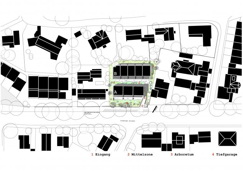 Auf einem stadtnahen mit alten Bäumen bestandenen Hanggrundstück entstand eine hochwertige verdichtete Wohnstruktur. Behutsam wurde die Bebauung aus acht Wohneinheiten in die Hangsituation eingepasst. Alle Wohnungen sind über eine gemeinsame Mittelzone zugänglich, die Bewohner und Besucher über einen terrassierten, baumbestandenen Zugang erreichen. Eine geschickt angelegte Erschließung der Tiefgarage lässt Platz für gemeinsam genutzte Garten- und Spielbereiche.