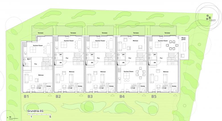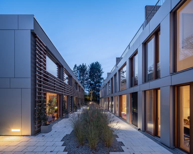 Die acht Wohneinheiten sind in zwei Reihen angeordnet: eine vordere Reihe mit drei und eine dahinter liegende Reihe mit fünf Wohneinheiten. Die Grundrissstruktur der Häuser fördert eine generationenübergreifende Nutzung, zahlreiche räumliche Varianten lassen sich je nach Lebenssituation anpassen.