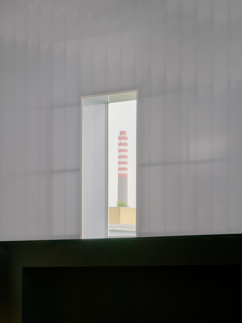 On the shorter side, a gradual abstraction of the façade elements occurs, culminating in the elevation facing the green system, where small irregular openings dematerialize the façade—except for one large selective opening oriented towards two symbolic landmarks of the community: the bell tower and the chimney.