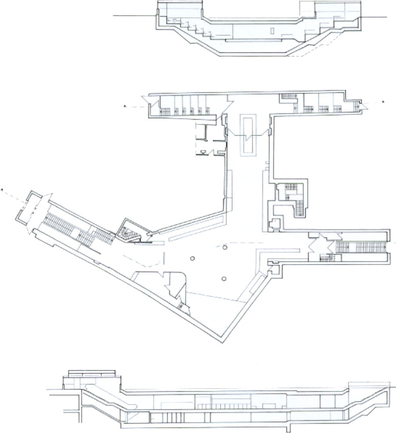 Die dargestellten Pavillons sind Überbauungen der Zugänge einer stillgelegten Fußgängerunterführung und dienen als Eingänge zu einem Club und einer Bar. Die Gestaltung der ober- und unterirdischen Bereiche bezieht sich konzeptionell auf Vorgefundenes (Bretter/Vitrinen/Erdproben/Schablonen usw.).
