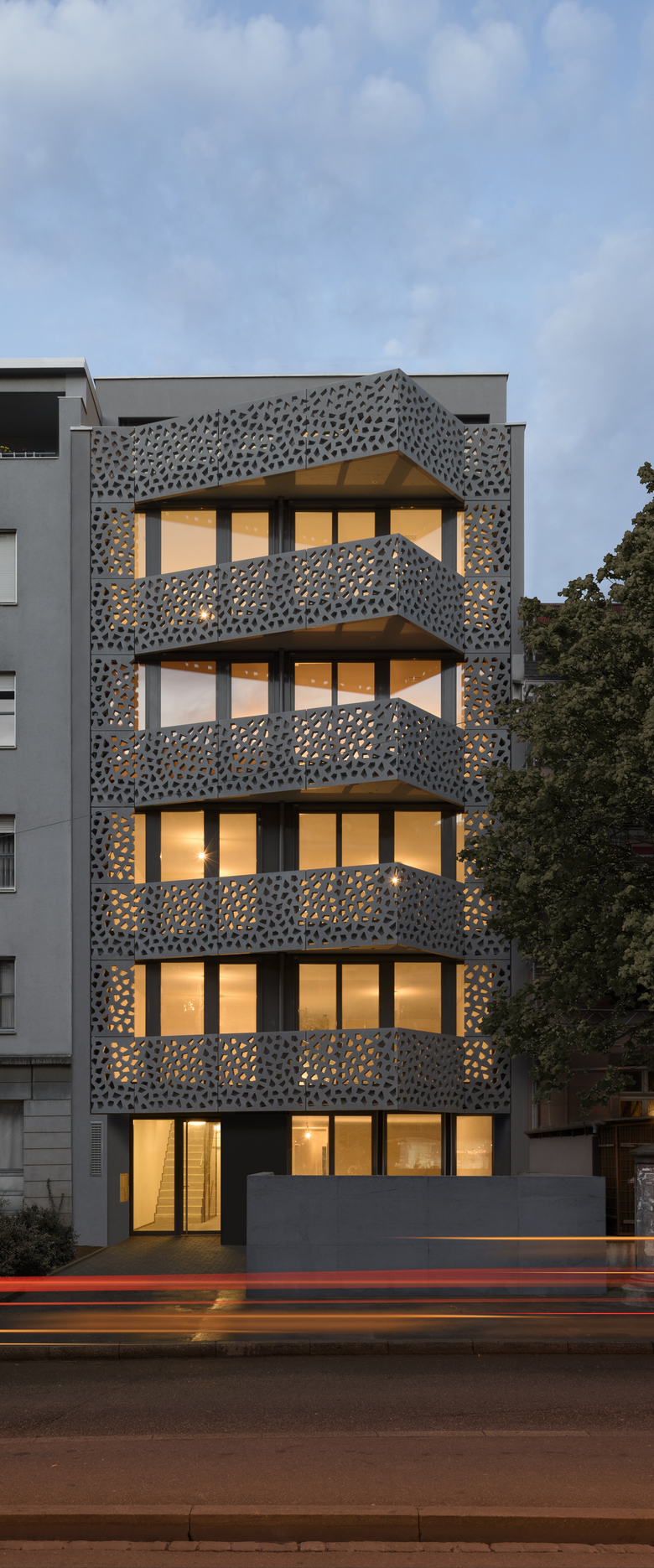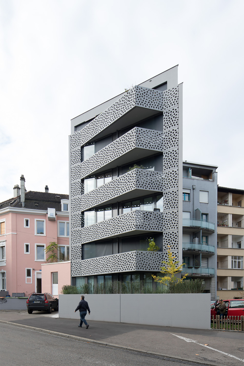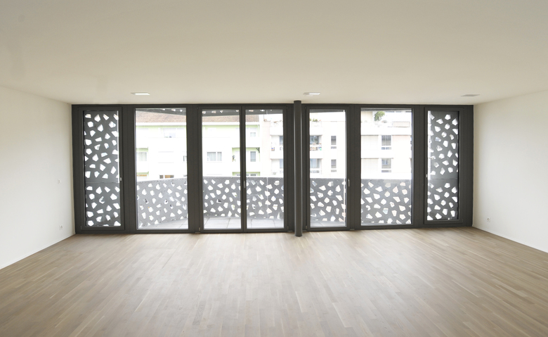 Das spezifische Zeichen des Gebäudes sind die perforierten Betonelemente beider Fassaden, kombiniert mit den grossen Glasflächen, sowie die abgeschrägten Terrassen, verleihen dem Gebäude eine moderne und glanzartige Ausstrahlung. Jede Wohnung liegt auf einem Geschoss. Die Attika-Wohnung ist mit zusätzlicher atemberaubender Dachterrasse erstellt. Die Gebäudehülle ist energetisch optimiert und die Wohnungen sind mit Komfort-Lüftungen ausgestat¬tet. Sowohl Treppenhaus und Lift, als auch die Wohnungen werden nach behindertengerechten Normen gebaut.