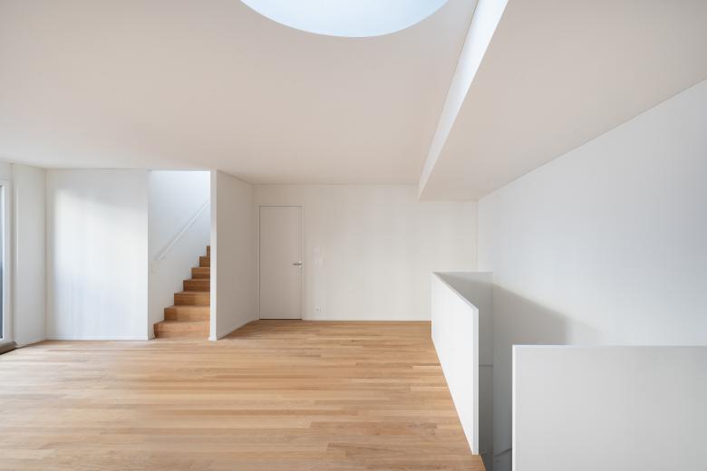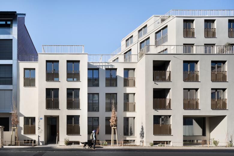 Die versetzten Geschosse schaffen eine dynamische Geometrie mit zahlreichen Dachterrassen, die spannende Ausblicke über die Stadt bieten. Trotz der urbanen Dichte wurde grosser Wert auf ökologische Ausgleichsmassnahmen gelegt: begrünte Dächer und Terrassen, Kletterpflanzen auf der Hofseite sowie vier Baumpflanzungen im Vorgarten.