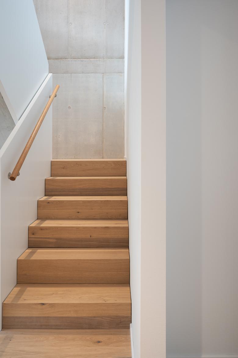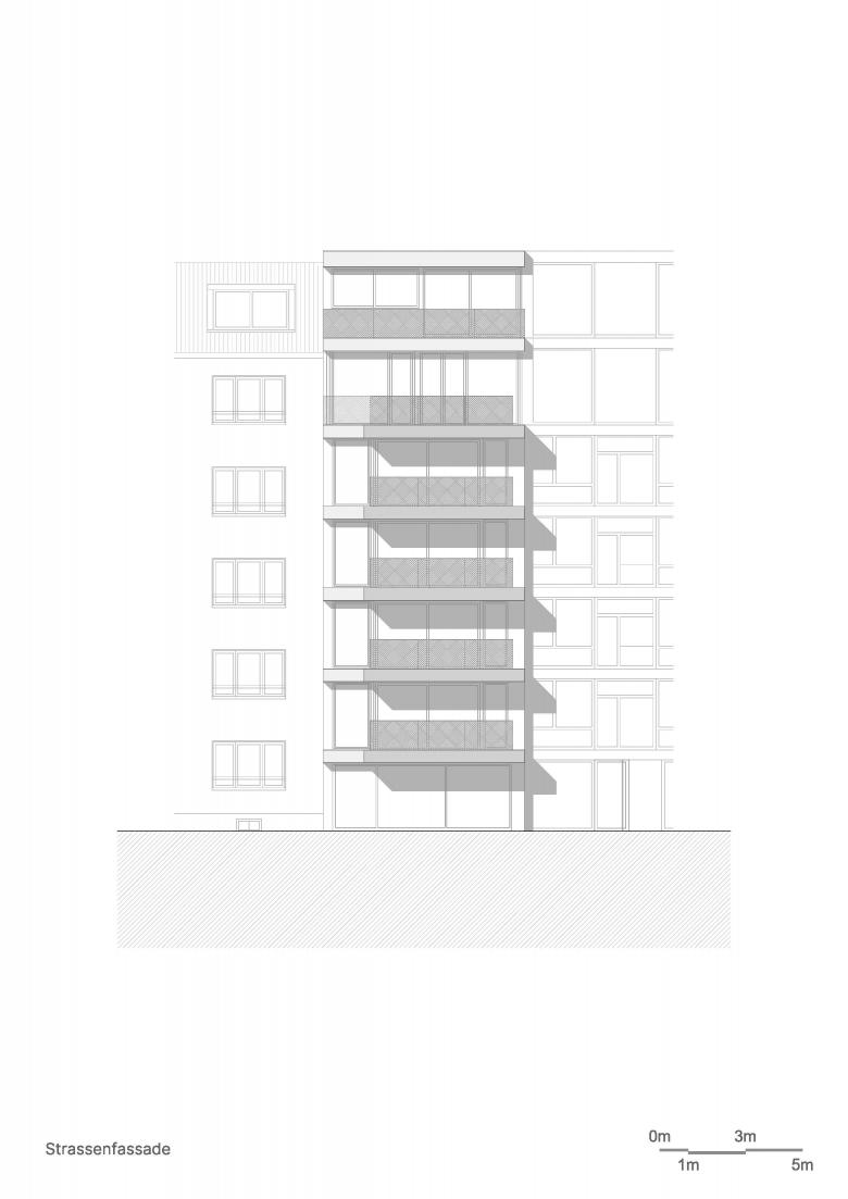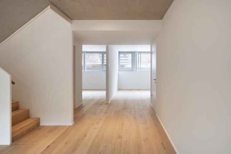 Gebäudehälfte mit dunkler Fensterrahmenfarbe: