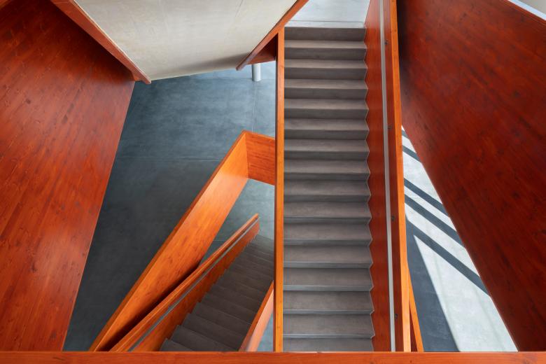 Eine grosszügige, offene Atriumtreppe verbindet alle vier Geschosse und fördert die Zusammenarbeit der verschiedenen Teams. Die Treppe ist durch ihre verwinkelte Form, Materialisierung und Farbgebung inszeniert und gibt dem Raum eine Orientierung.
