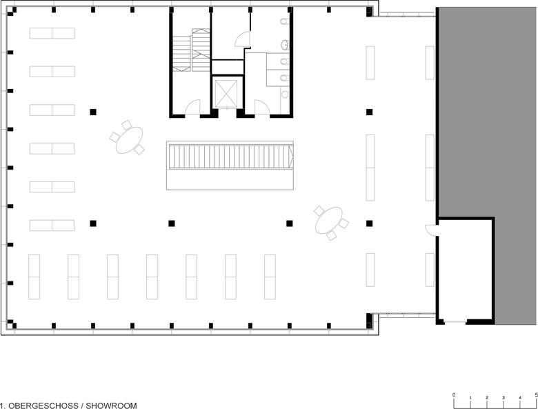 Das Raumprogramm im Erd- und Obergeschoss besteht aus Showroom, Empfang, Ausstellung, Auditorium und Kaffee.