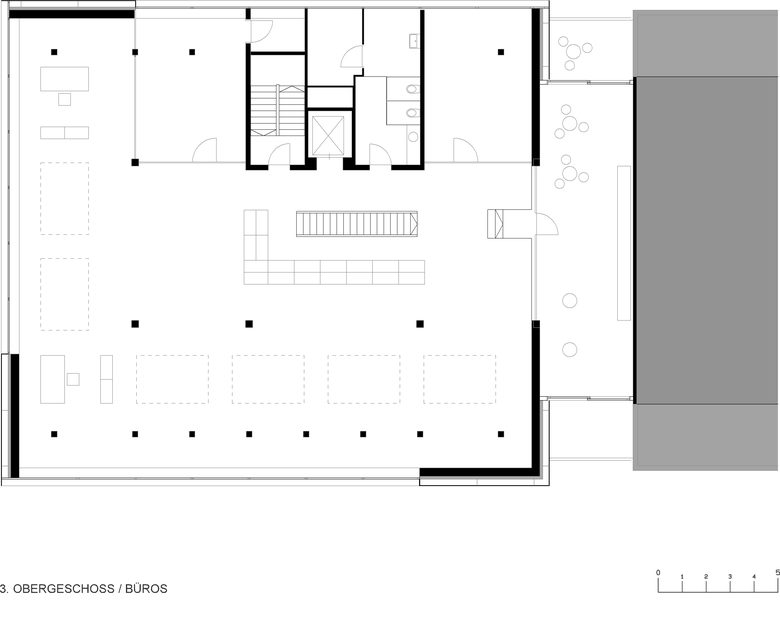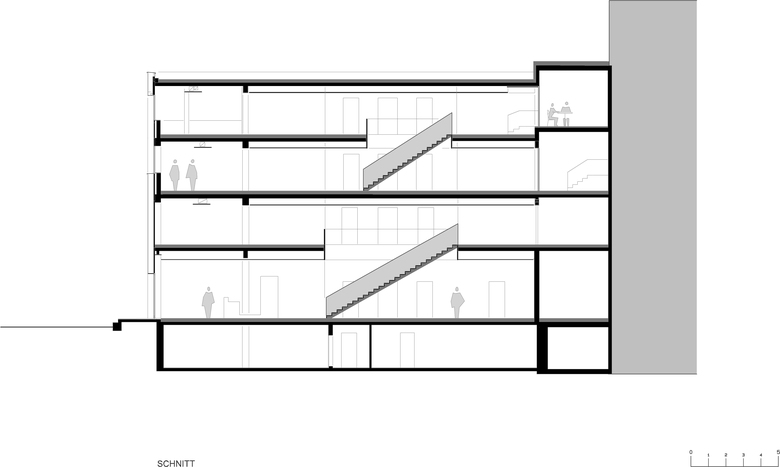 Dieser Bereich ist öffentlich zugänglich und wird durch Besucher frequentiert. Im 2. und 3. Obergeschoss befinden sich Büroräume, Prototypenraum, Kantine für Mitarbeiter, Bibliothek und Sitzungsräume.