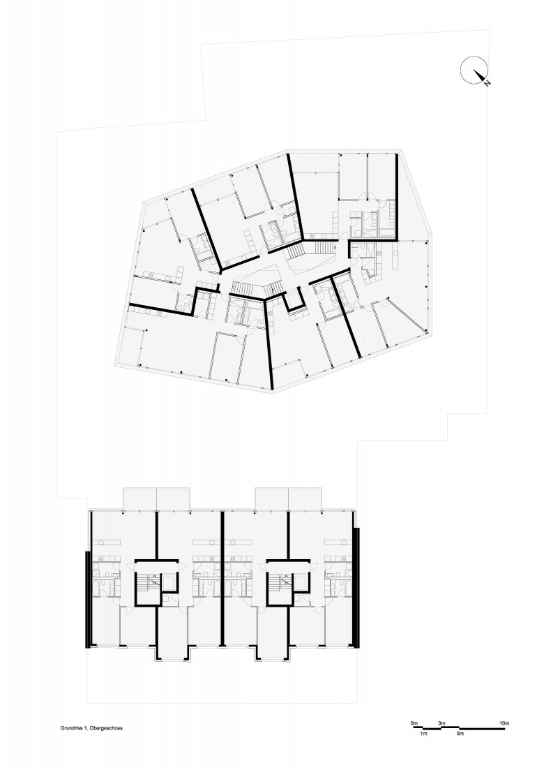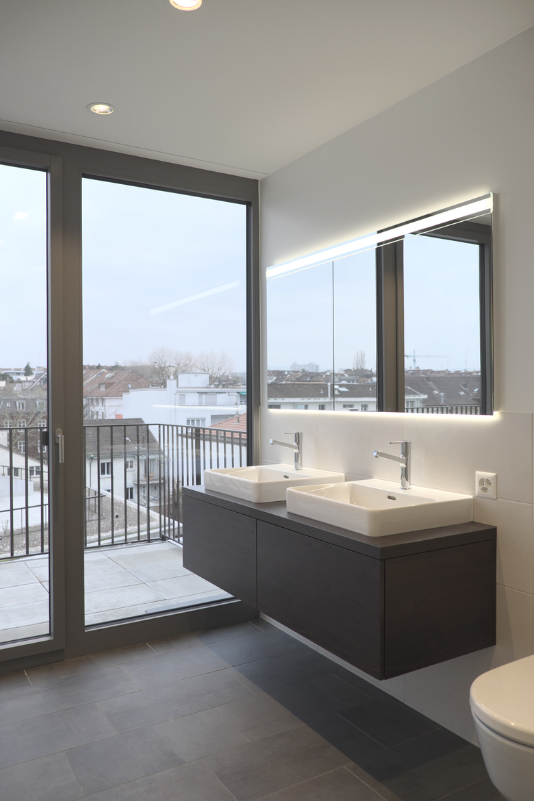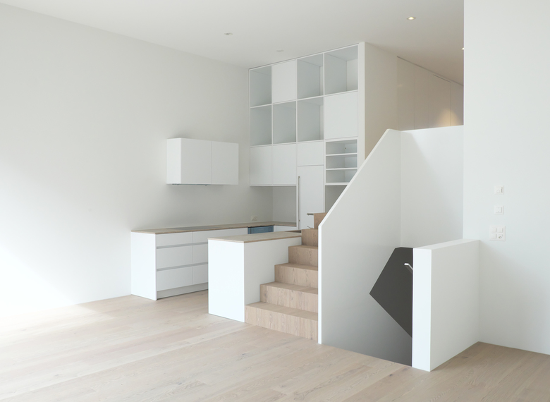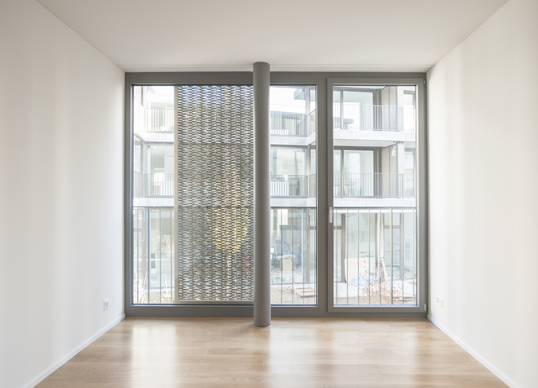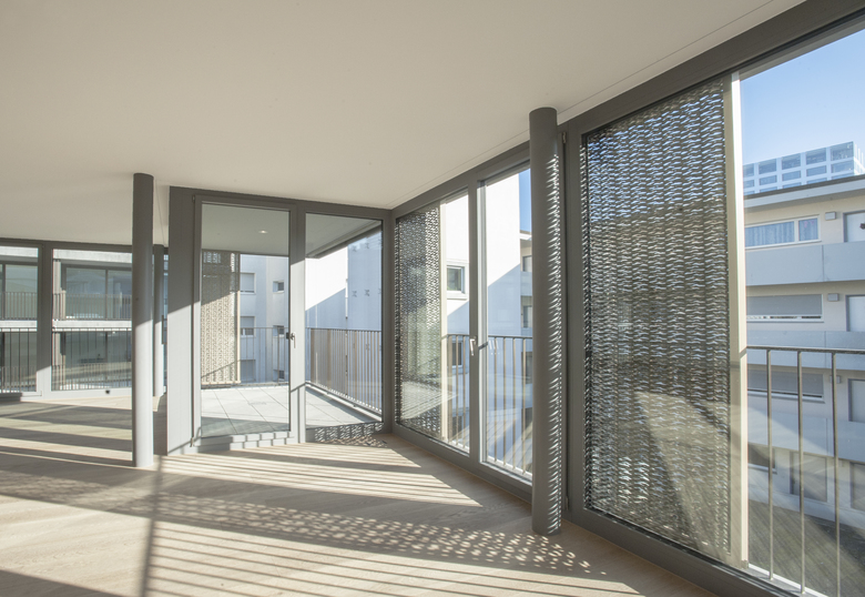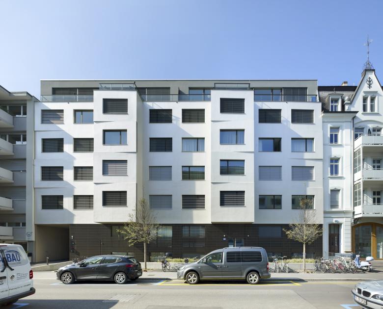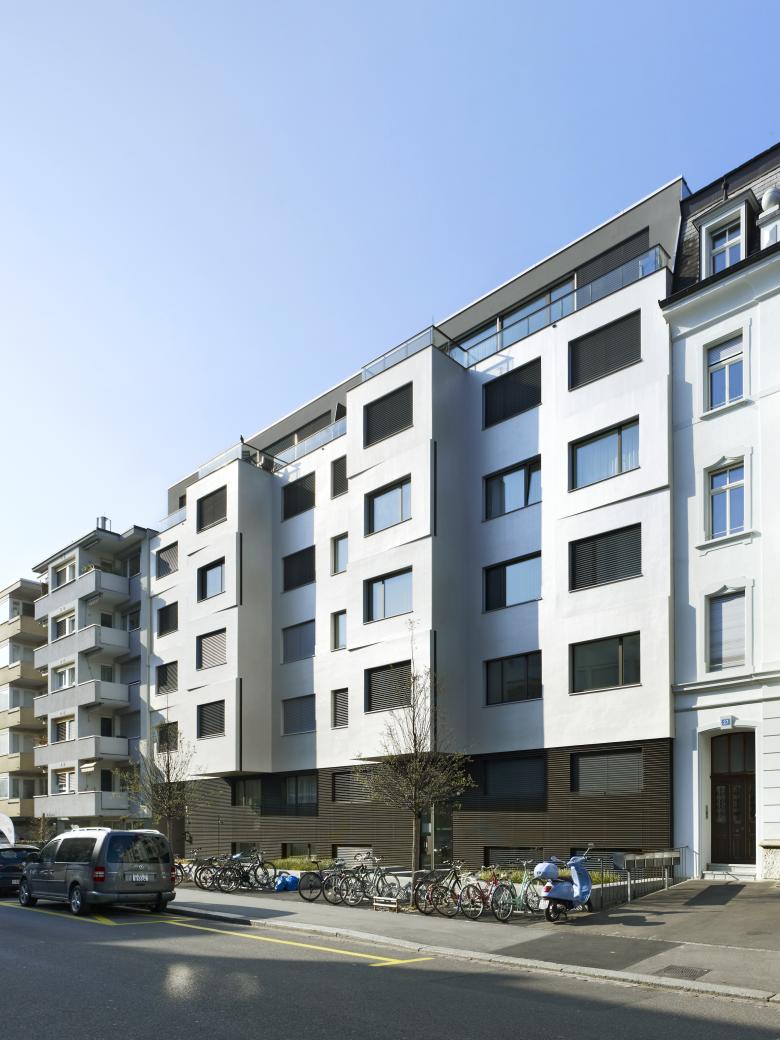 Die 43 Wohnungen sind attraktiv organisiert. Die durchgehenden Wohnungen haben aufgrund ihrer Geometrie eine hohe räumliche Qualität. Elf 3½ bis 5½ Zimmer-Wohnungen finden darin ihren Platz. Die Splitt-Level Erdgeschosswohnungen mit ihrem überhöhten Wohnraum verfügen über einen Gartenanteil.