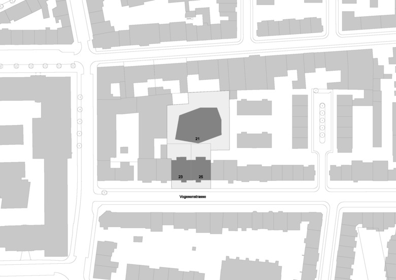 Der Bau an der Vogesenstrasse ist als Vierspänner konzipiert. Das kleine Ausklinken der Erker der Fassade zur Vogesenstrasse hin ermöglicht interessante Ausblicke in den Strassenraum.