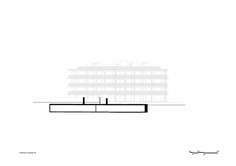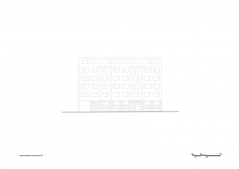 Die Überbauung besteht aus dem fünfgeschossigen Vorderhaus als Blockrandbebauung und dem im Garten freigestellten Hofgebäude.