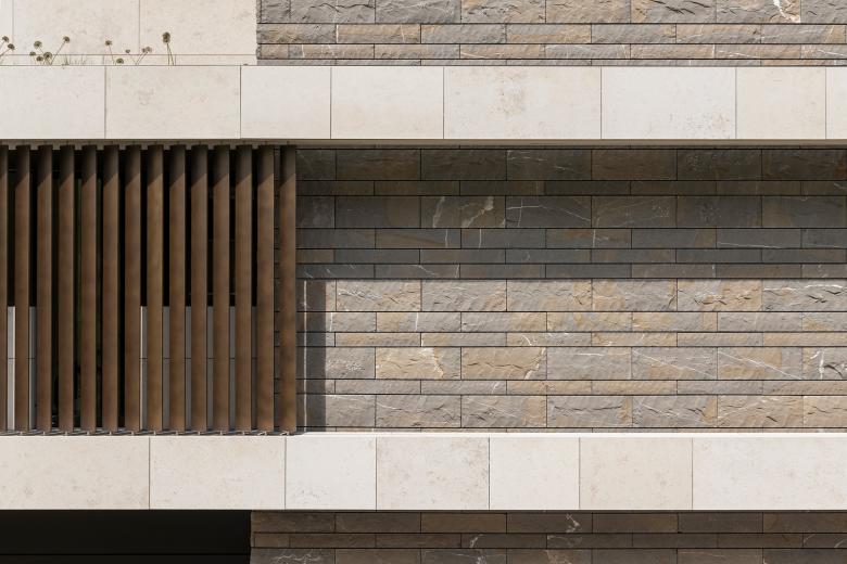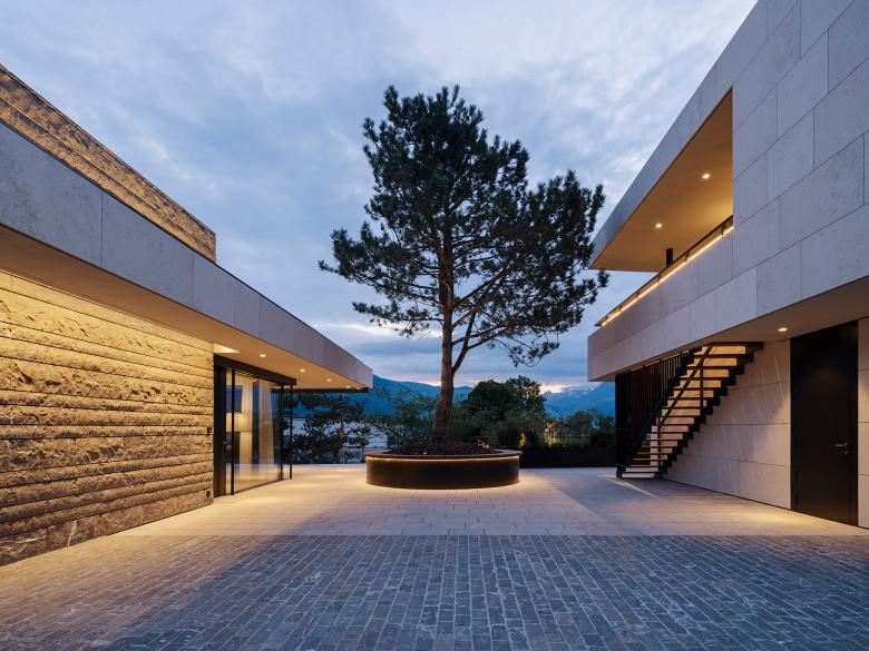 Entstanden ist eine moderne, dynamische und äusserst wohnliche Interpretation einer klassischen Wohnanlage, die sich auch mit grossen Dimensionen bewusst in die Typologie des Einfamilienhaus einreihen lässt. Das äusserst grosszügige Einfamilienhaus versteht sich als zeitgemässe Übersetzung eines „Case-Study-House“. Ein geerdetes Fundament bilden die unteren Geschosse der Villa, deren Fassade mit roh, gebrochenem Pietra di Piasentina aus Italien bekleidet ist. Die oberen Etagen legen sich elegant, schwebend darüber, was vom Erscheinungsbild des weissen Kalkstein zusätzlich verstärkt wird. In Wechselwirkung treten ebenso die Orte des Rückzugs und des Wohnen und Träumens. Mittelpunkt des Wohnens ist der zweigeschossige Essraum. Der unverwechselbare Charakter der Umgebung wird von der einladenden Gartenanlage mit Infinitypool geformt ebenso wie vom separaten Pool- und Gästehaus, die gemeinsam ein gekonntes Ensemble bildet.